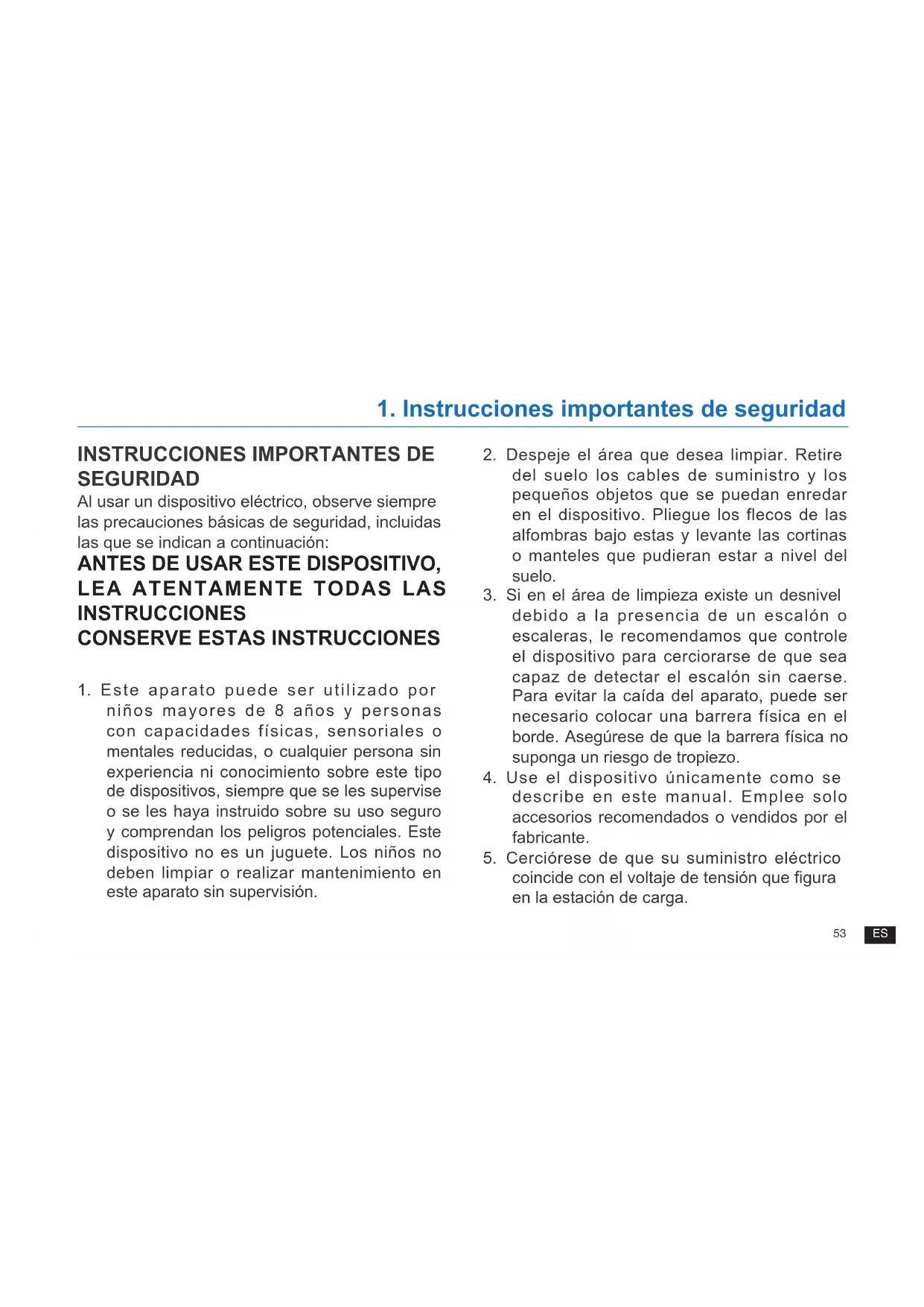 1 Este aparato puede ser utilizado por niños mayores de 8 años y personas con capacidades físicas, sensoriales o mentales reducidas, o cualquier persona sin experiencia ni conocimiento sobre este tipo de dispositivos, siempre que se les supervise o se les haya instruido sobre su uso seguro y comprendan los peligros potenciales Este dispositivo no es un juguete Los niños no deben limpiar o realizar mantenimiento en este aparato sin supervisión 2 Despeje el área que desea limpiar Retire del suelo los cables de suministro y los pequeños objetos que se puedan enredar en el dispositivo Pliegue los flecos de las alfombras bajo estas y levante las cortinas o manteles que pudieran estar a nivel del suelo 3 Si en el área de limpieza existe un desnivel debido a la presencia de un escalón o escaleras, le recomendamos que controle el dispositivo para cerciorarse de que sea capaz de detectar el escalón sin caerse Para evitar la caída del aparato, puede ser necesario colocar una barrera física en el borde Asegúrese de que la barrera física no suponga un riesgo de tropiezo 4 Use el dispositivo únicamente como se describe en este manual Emplee solo accesorios recomendados o vendidos por el fabricante 5 Cerciórese de que su suministro eléctrico coincide con el voltaje de tensión que gura en la estación de carga