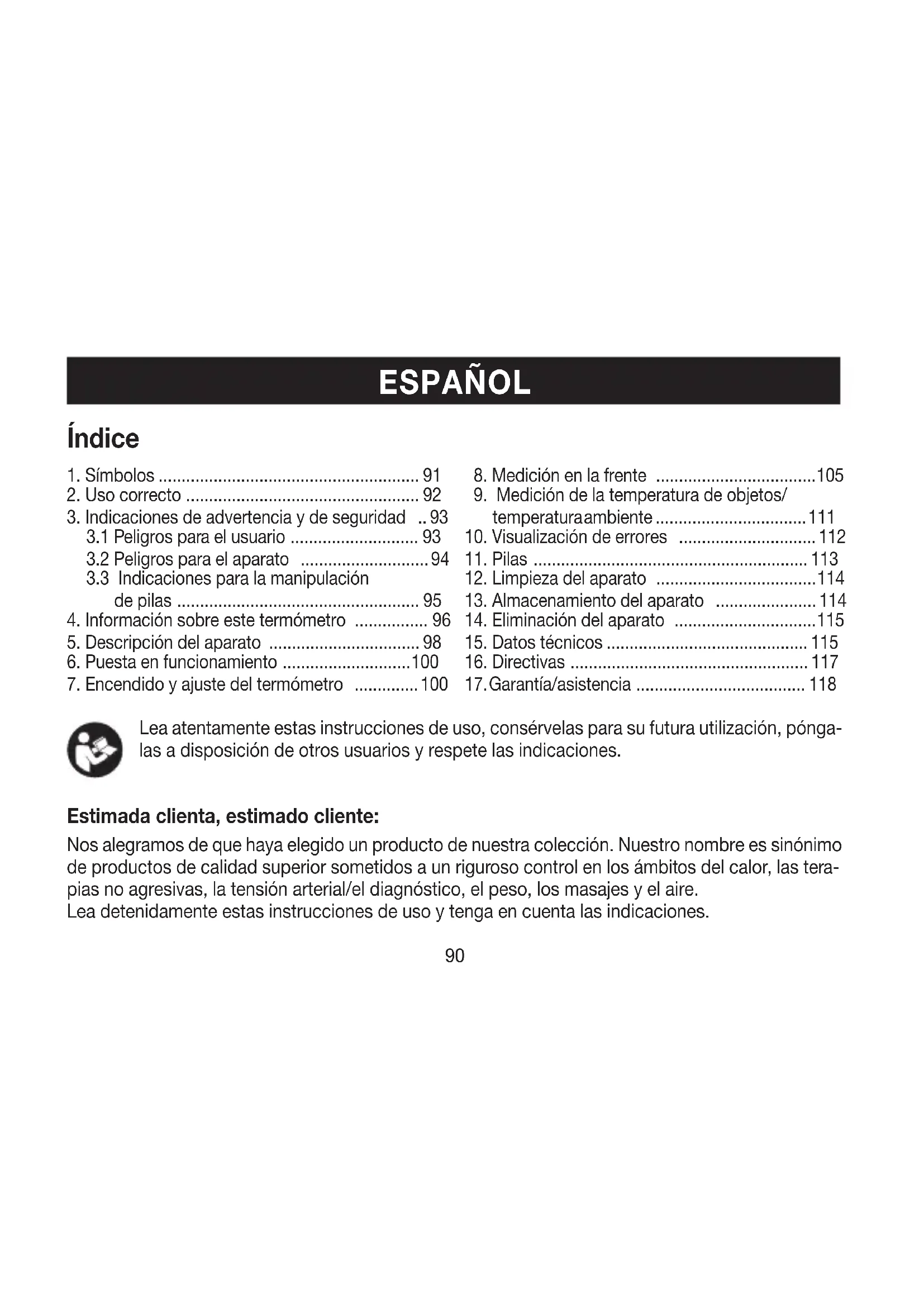 rriente eléctrica o en lugares polvorientos. De lo contrario, podría realizar mediciones imprecisas.115 Si no va a usar el termómetro durante mucho tiempo, extraiga las pilas.