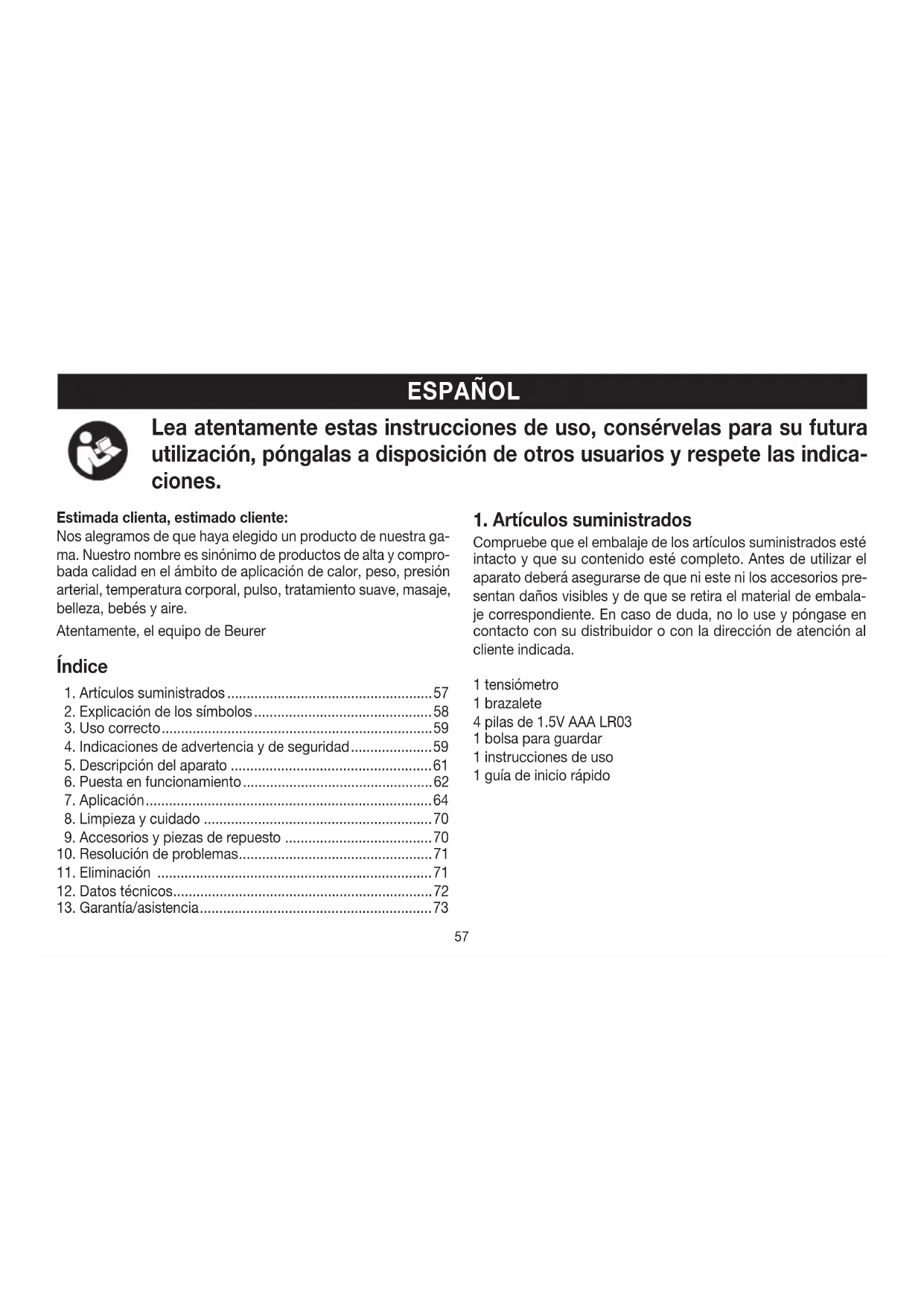 Compruebe que el embalaje de los artículos suministrados esté intacto y que su contenido esté completo. Antes de utilizar el aparato deberá asegurarse de que ni este ni los accesorios pre- sentan daños visibles y de que se retira el material de embala- je correspondiente. En caso de duda, no lo use y póngase en contacto con su distribuidor o con la dirección de atención al cliente indicada. 1 tensiómetro 1 brazalete 4 pilas de 1.5V AAA LR03 1 bolsa para guardar 1 instrucciones de uso 1 guía de inicio rápido58