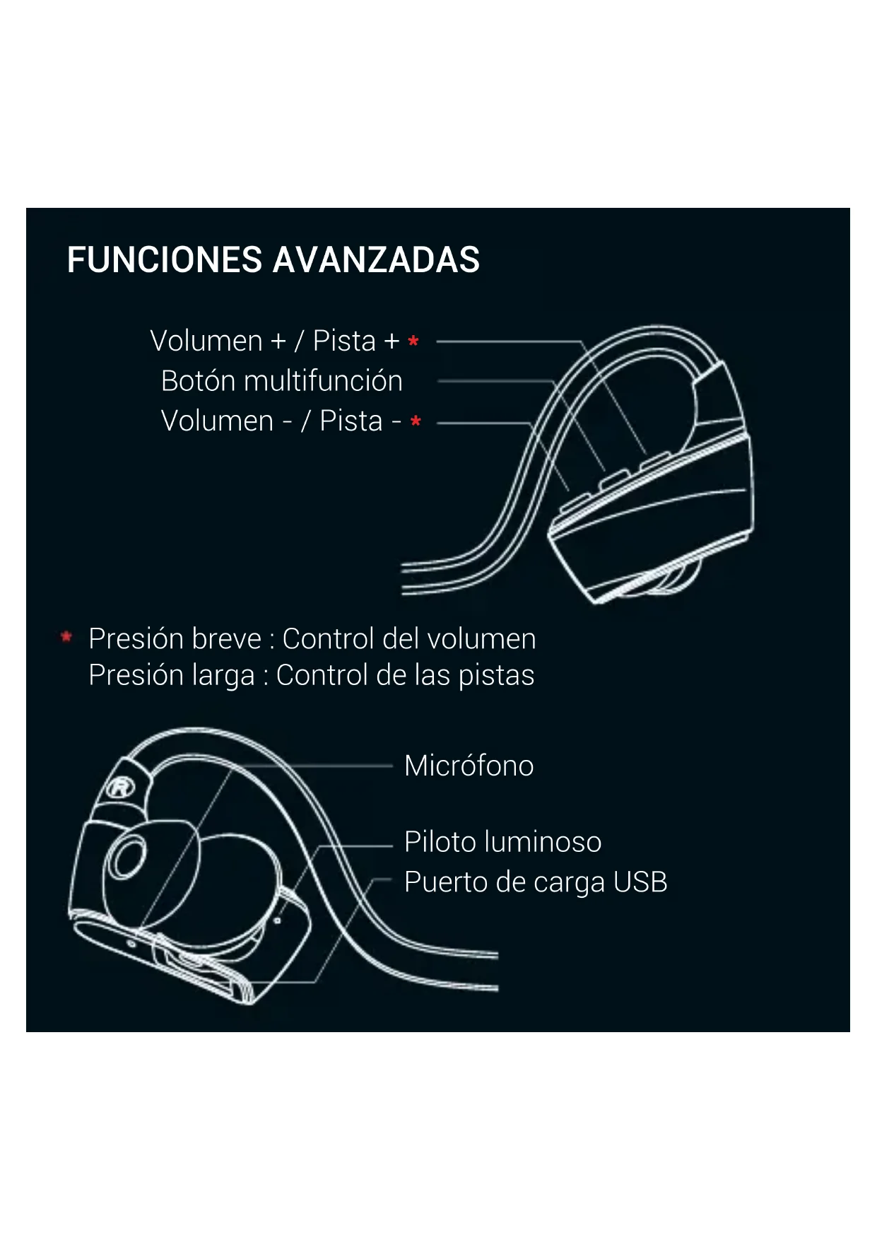 - Presión breve: Control del volumen Presión larga: Control de las pistas