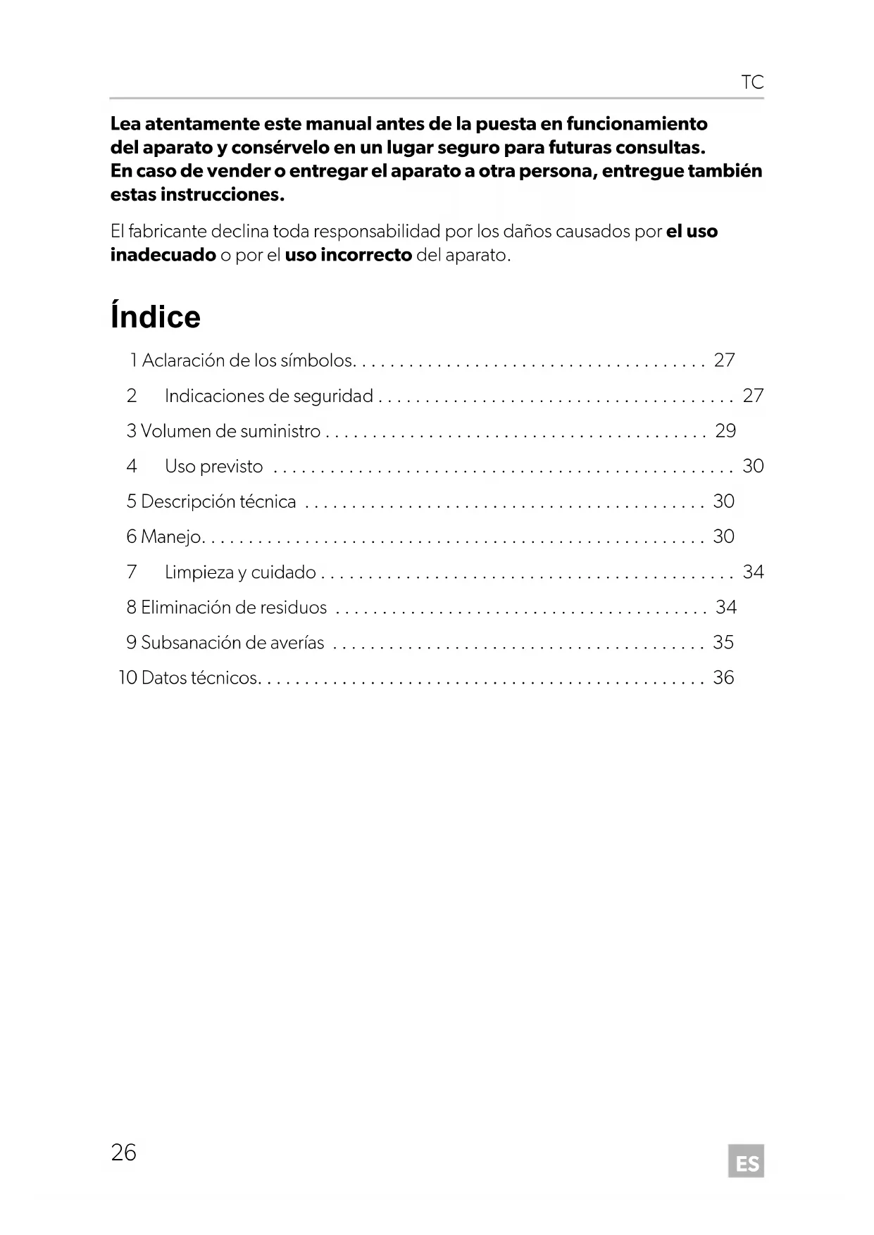 - Lea atentamente este manual antes de la puesta en funcionamiento del aparato y consérvelo en un lugar seguro para futuras consultas. En caso de vender o entregar el aparato a otra persona, entregue también estas instrucciones. El fabricante declina toda responsabilidad por los daños causados por el uso inadecuado o por el uso incorrecto del aparato. Índice 1 Aclaración de los símbolos p. 27