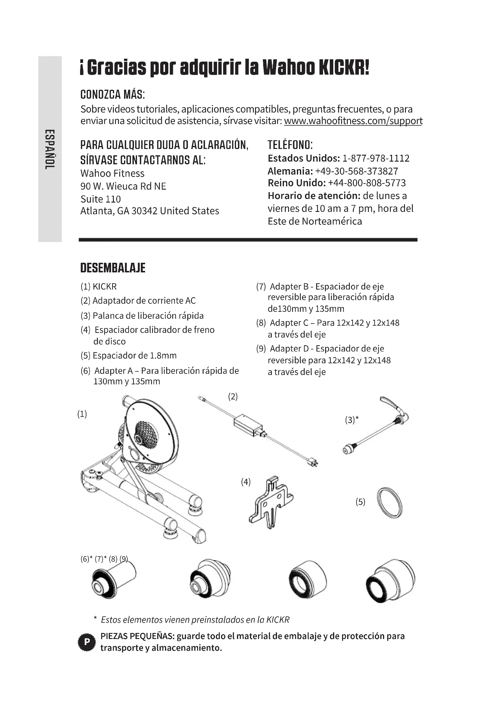 (3)* SCALE 0.750 (2) (1) (5) (4) Gracias por adquirir la Wahoo KICKR! CONOZCA MÁS: Sobre videos tutoriales, aplicaciones compatibles, preguntas frecuentes, o para enviar una solicitud de asistencia, sírvase visitar: www.wahoofitness.com/support PARA CUALQUIER DUDA O ACLARACIÓN, SÍRVASE CONTACTARNOS AL: Wahoo Fitness 90 W. Wieuca Rd NE Suite 110 Atlanta, GA 30342 United States TELÉFONO: Estados Unidos: 1-877-978-1112 Alemania: +49-30-568-373827 Reino Unido: +44-800-808-5773 Horario de atención: de lunes a viernes de 10 am a 7 pm, hora del Este de Norteamérica DESEMBALAJE (1) KICKR (2) Adaptador de corriente AC (3) Palanca de liberación rápida (4) Espaciador calibrador de freno de disco (5) Espaciador de 1.8mm (6) Adapter A – Para liberación rápida de 130mm y 135mm (7) Adapter B - Espaciador de eje reversible para liberación rápida de130mm y 135mm (8) Adapter C – Para 12x142 y 12x148 a través del eje (9) Adapter D - Espaciador de eje reversible para 12x142 y 12x148 a través del eje (6)* (7)* (8) (9) ESPAÑOL