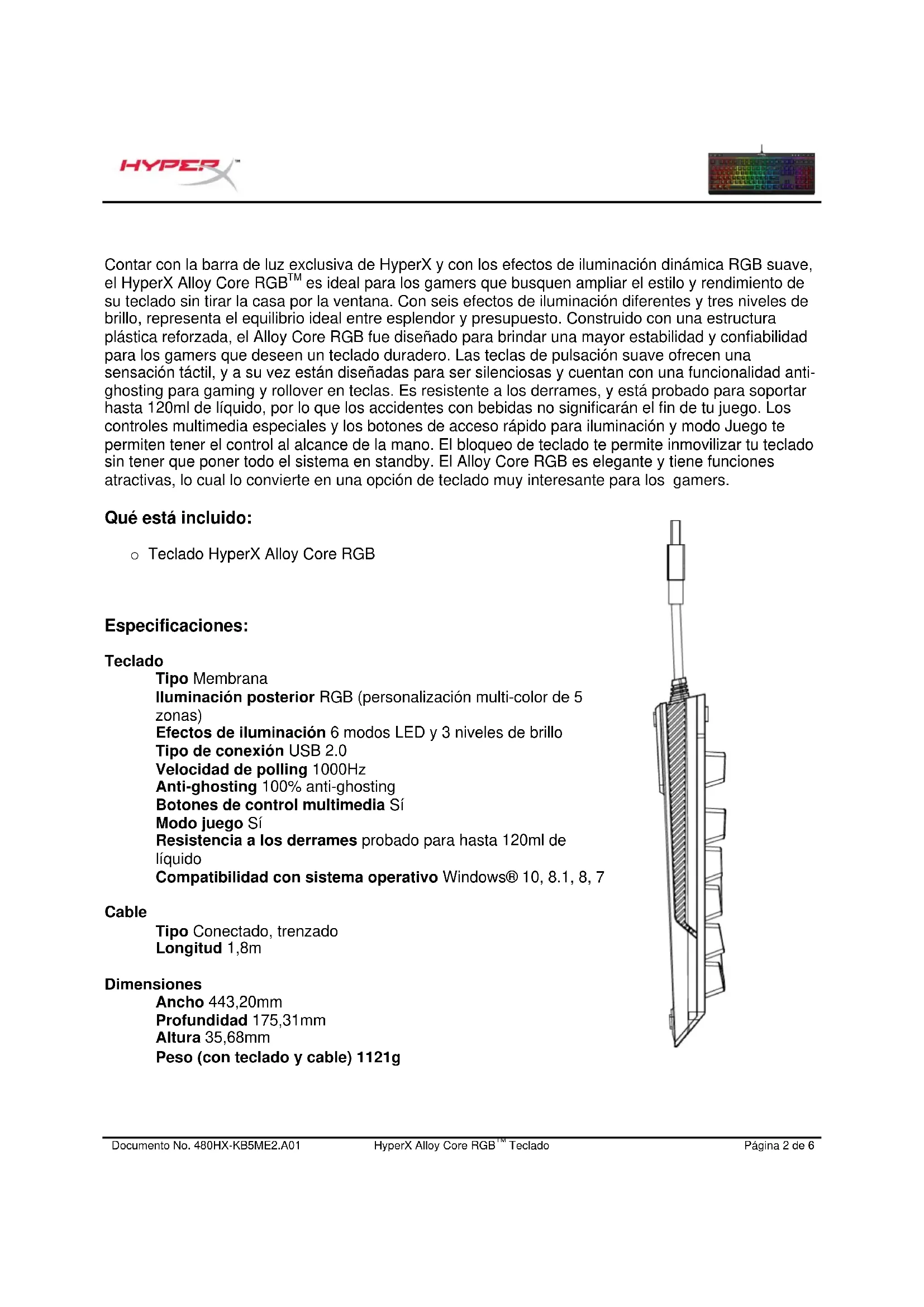 ¿Tienes alguna pregunta o consulta sobre la instalación? Póngase en contacto con el equipo de ayuda de HyperX en hyperxgaming.com/support/keyboards.Dokument Nr. 480HX-KB5ME2.A01 HyperX Alloy Core RGB Tastatur Seite 1 von 6