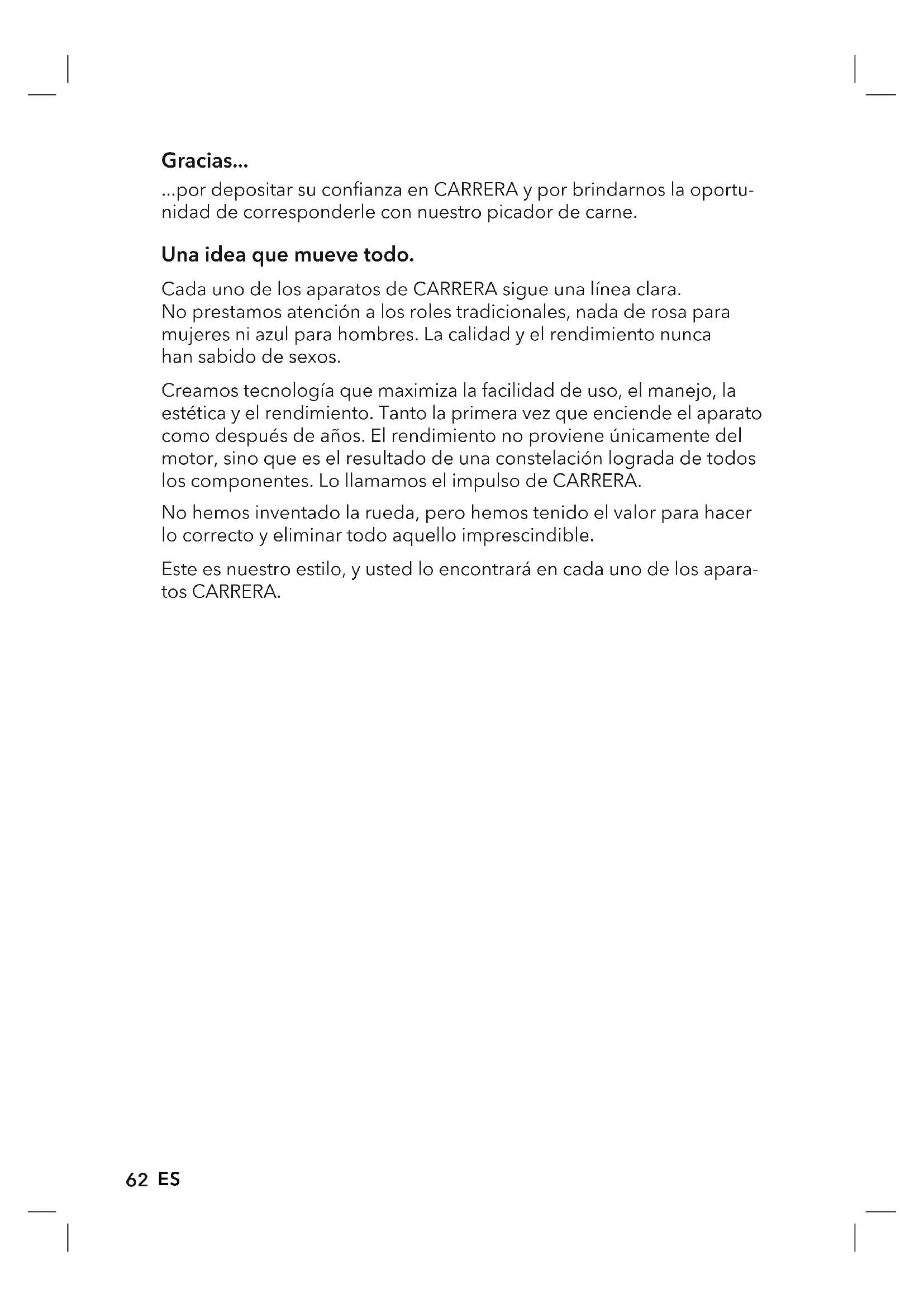 Gracias... ...por depositar su confianza en CARRERA y por brindarnos la oportu- nidad de corresponderle con nuestro picador de carne. Una idea que mueve todo. Cada uno de los aparatos de CARRERA sigue una línea clara. No prestamos atención a los roles tradicionales, nada de rosa para mujeres ni azul para hombres. La calidad y el rendimiento nunca han sabido de sexos. Creamos tecnología que maximiza la facilidad de uso, el manejo, la estética y el rendimiento. Tanto la primera vez que enciende el aparato como después de años. El rendimiento no proviene únicamente del motor, sino que es el resultado de una constelación lograda de todos los componentes. Lo llamamos el impulso de CARRERA. No hemos inventado la rueda, pero hemos tenido el valor para hacer lo correcto y eliminar todo aquello imprescindible. Este es nuestro estilo, y usted lo encontrará en cada uno de los apara- tos CARRERA.63