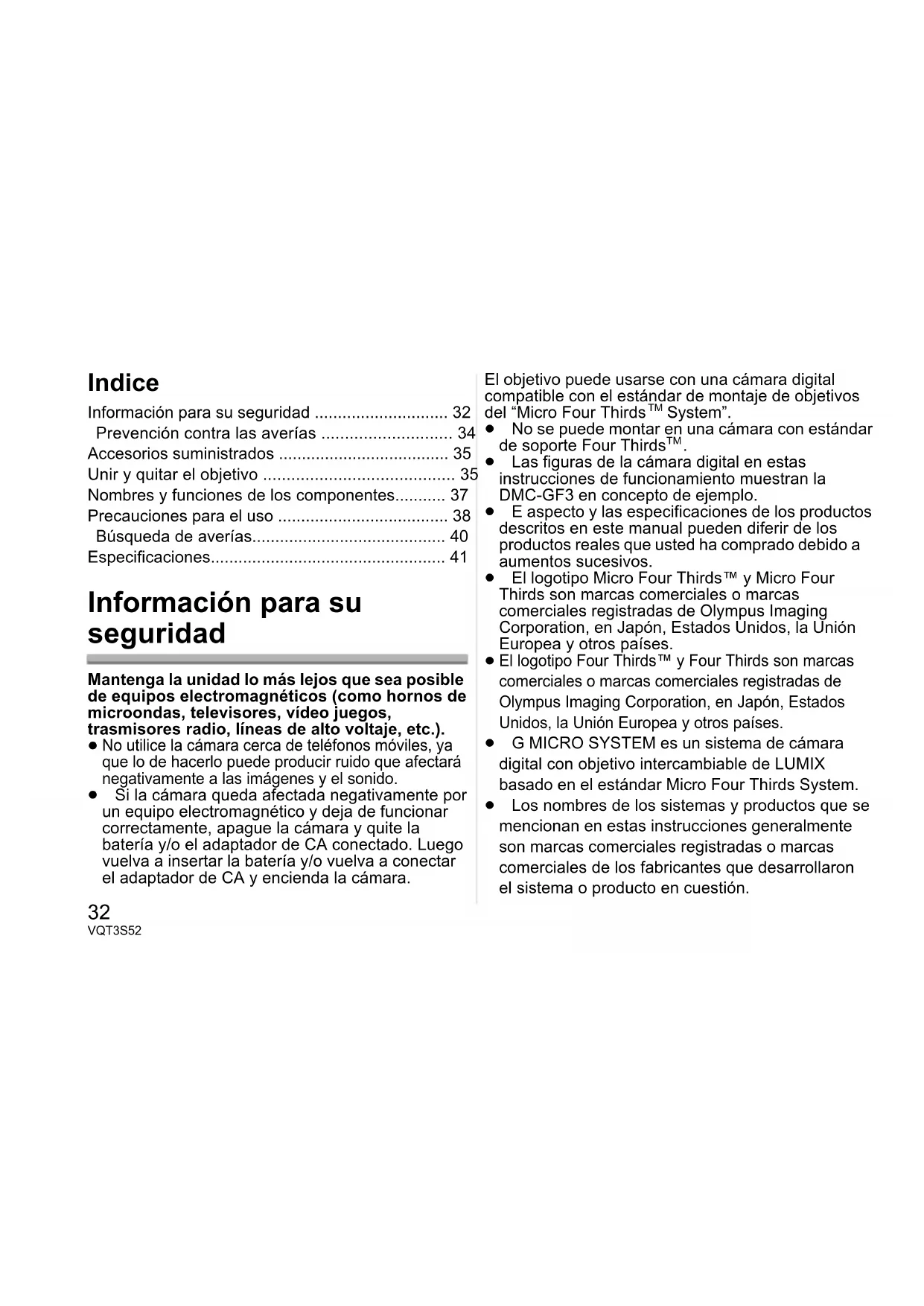 ≥ Las figuras de la cámara digital en estas instrucciones de funcionamiento muestran la DMC-GF3 en concepto de ejemplo. ≥ E aspecto y las especificaciones de los productos descritos en este manual pueden diferir de los productos reales que usted ha comprado debido a aumentos sucesivos. ≥ El logotipo Micro Four Thirds™ y Micro Four Thirds son marcas comerciales o marcas comerciales registradas de Olympus Imaging Corporation, en Japón, Estados Unidos, la Unión Europea y otros países.