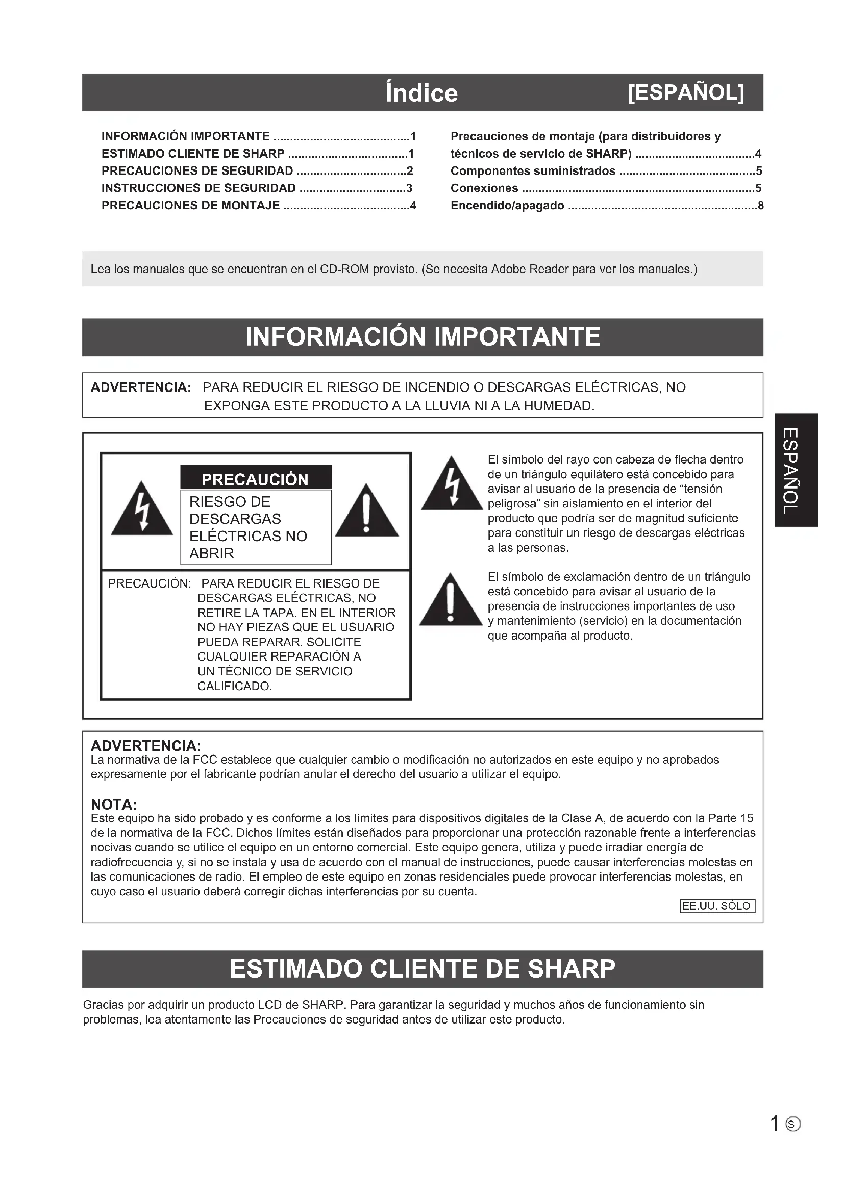 ABRIR Gracias por adquirir un producto LCD de SHARP. Para garantizar la seguridad y muchos años de funcionamiento sin problemas, lea atentamente las Precauciones de seguridad antes de utilizar este producto.