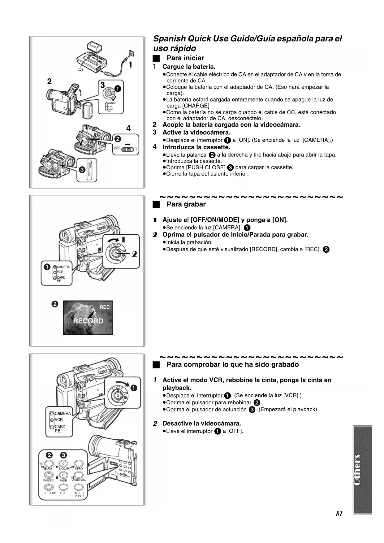 Spanish Quick Use Guide/Guía española para el uso rápido ª Para iniciar Cargue la batería.≥Conecte el cable eléctrico de CA en el adaptador de CA y en la toma de corriente de CA.≥Coloque la batería con el adaptador de CA. (Eso hará empezar la carga).≥La batería estará cargada enteramente cuando se apague la luz de carga [CHARGE].≥Como la batería no se carga cuando el cable de CC. está conectado con el adaptador de CA, desconéctelo.
