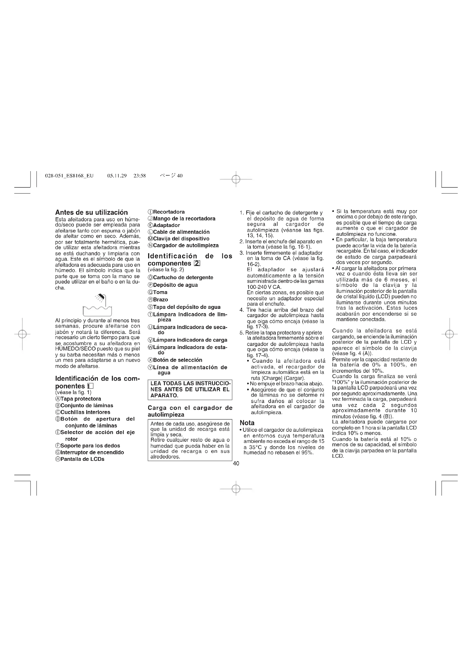 028-051ES8168EU 05.11.29 23:58 ページ4032 Conjunto de láminas (véase la fig. 8) El conjunto de láminas exteriores comprende una cuchilla ranurada (a) entre 2 láminas (b). Se mueven arriba y abajo de forma indepen-diente siguiendo el contorno de la cara. La hoja ranurada agarra y corta los pelos más largos y aplastados fácilmente. Afeitado húmedo Aplique una fina capa de espuma de afeitar sobre la piel; la espuma actuará como lubricante. De todos los productos para facilitar el afeitado (gel, jabón, crema, etc.), la espuma es el más adecuado. No aplique demasiada espuma, ya que podría alterar el funcionamiento de la afeitadora. Si el cabezal de la máquina queda taponado con espuma, sólo tiene que enjuagarlo bajo el agua corriente. Utilización de la recorta- dora (véase la fig. 9) Deslice el mando de la recortadora hacia arriba hasta que oiga un clic. Coloque la recortadora en ángulo recto con respecto a la piel y muévala hacia abajo para recortar las patillas. Limpieza de la afeitadora 1 Limpieza con cargador de autolimpieza Preparación del cargador de autolimpieza Advertencia – No lave ni moje el adaptador ni el cargador de autolimpieza. Si no sigue esta indicación pueden producirse descargas eléctricas o cortocircuitos.