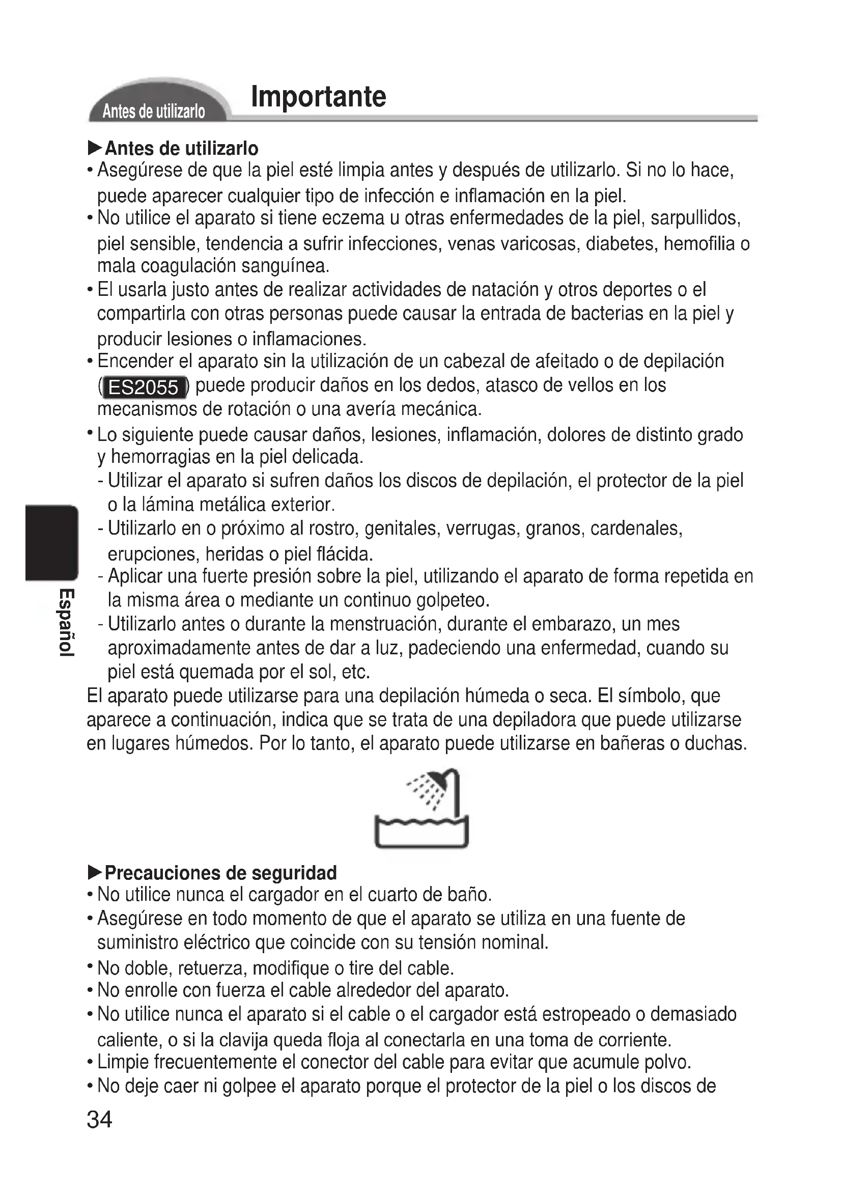 ES2055 ) puede producir daños en los dedos, atasco de vellos en los mecanismos de rotación o una avería mecánica. Lo siguiente puede causar daños, lesiones, inamación, dolores de distinto grado y hemorragias en la piel delicada. Utilizar el aparato si sufren daños los discos de depilación, el protector de la piel o la lámina metálica exterior. Utilizarlo en o próximo al rostro, genitales, verrugas, granos, cardenales, erupciones, heridas o piel ácida. Aplicar una fuerte presión sobre la piel, utilizando el aparato de forma repetida en la misma área o mediante un continuo golpeteo. Utilizarlo antes o durante la menstruación, durante el embarazo, un mes aproximadamente antes de dar a luz, padeciendo una enfermedad, cuando su piel está quemada por el sol, etc. El aparato puede utilizarse para una depilación húmeda o seca. El símbolo, que aparece a continuación, indica que se trata de una depiladora que puede utilizarse en lugares húmedos. Por lo tanto, el aparato puede utilizarse en bañeras o duchas. 1Precauciones de seguridad No utilice nunca el cargador en el cuarto de baño. Asegúrese en todo momento de que el aparato se utiliza en una fuente de suministro eléctrico que coincide con su tensión nominal. No doble, retuerza, modique o tire del cable. No enrolle con fuerza el cable alrededor del aparato. No utilice nunca el aparato si el cable o el cargador está estropeado o demasiado caliente, o si la clavija queda oja al conectarla en una toma de corriente. Limpie frecuentemente el conector del cable para evitar que acumule polvo. No deje caer ni golpee el aparato porque el protector de la piel o los discos de
