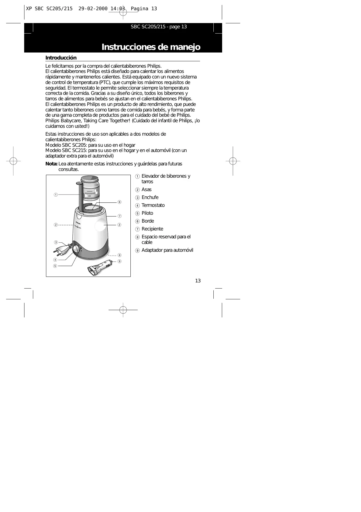 entre +7° C and +37° C Instrucciones de manejo Introducción Le felicitamos por la compra del calientabiberones Philips. El calientabiberones Philips está diseñado para calentar los alimentos rápidamente y mantenerlos calientes. Está equipado con un nuevo sistema de control de temperatura (PTC), que cumple los máximos requisitos de seguridad. El termostato le permite seleccionar siempre la temperatura correcta de la comida. Gracias a su diseño único, todos los biberones y tarros de alimentos para bebés se ajustan en el calientabiberones Philips. El calientabiberones Philips es un producto de alto rendimiento, que puede calentar tanto biberones como tarros de comida para bebés, y forma parte de una gama completa de productos para el cuidado del bebé de Philips. Philips Babycare, Taking Care Together! (Cuidado del infantil de Philips, ¡lo cuidamos con usted!) Estas instrucciones de uso son aplicables a dos modelos de calientabiberones Philips: Modelo SBC SC205: para su uso en el hogar Modelo SBC SC215: para su uso en el hogar y en el automóvil (con un adaptador extra para el automóvil) Nota: Lea atentamente estas instrucciones y guárdelas para futuras consultas. 1 Elevador de biberones y tarros 2 Asas