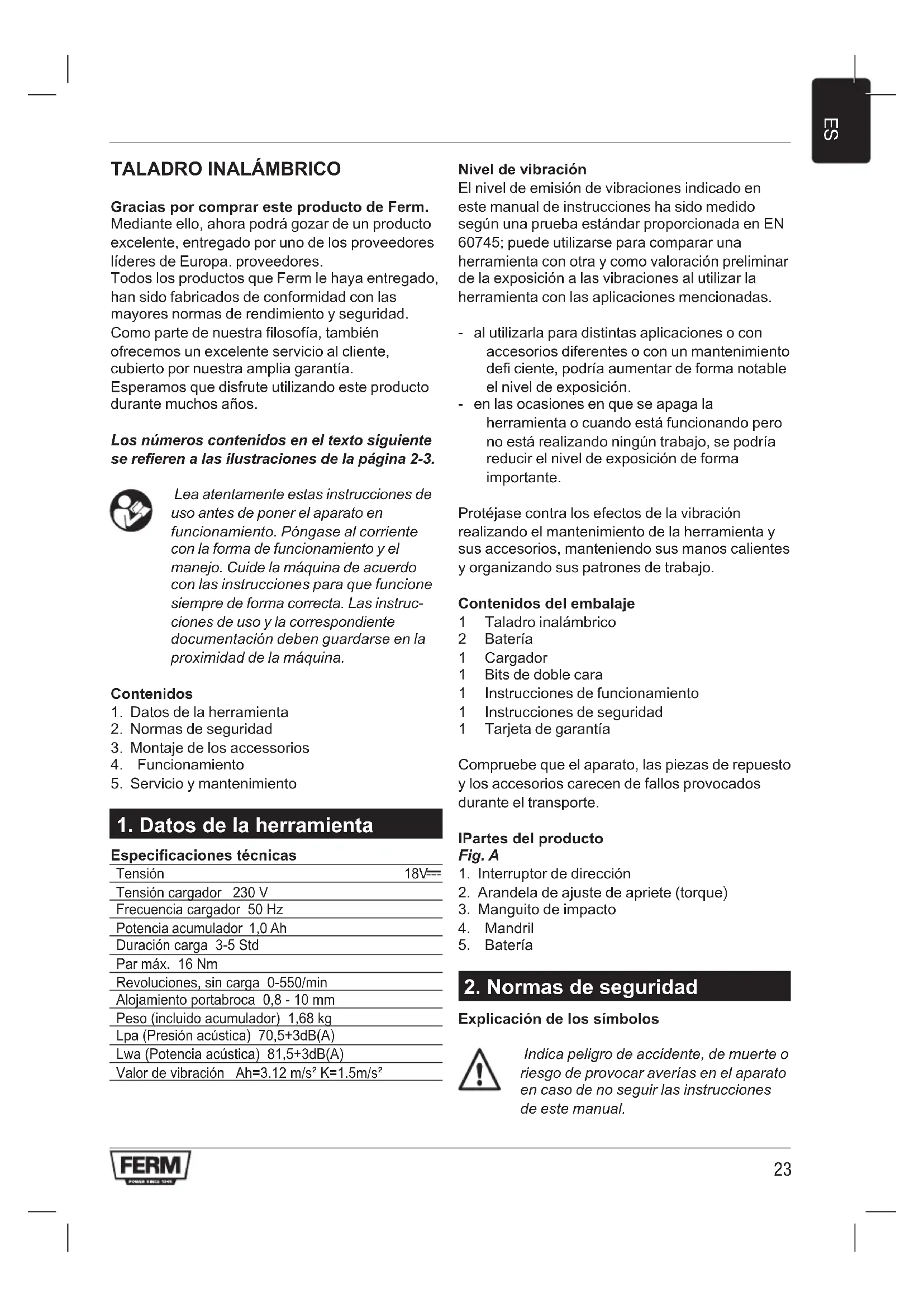 Gracias por comprar este producto de Ferm. Mediante ello, ahora podrá gozar de un producto excelente, entregado por uno de los proveedores líderes de Europa. proveedores. Todos los productos que Ferm le haya entregado, han sido fabricados de conformidad con las mayores normas de rendimiento y seguridad. Como parte de nuestra filosofía, también ofrecemos un excelente servicio al cliente, cubierto por nuestra amplia garantía. Esperamos que disfrute utilizando este producto durante muchos años. Los números contenidos en el texto siguiente se refieren a las ilustraciones de la página 2-3. Lea atentamente estas instrucciones de uso antes de poner el aparato en funcionamiento. Póngase al corriente con la forma de funcionamiento y el manejo. Cuide la máquina de acuerdo con las instrucciones para que funcione siempre de forma correcta. Las instruc- ciones de uso y la correspondiente documentación deben guardarse en la proximidad de la máquina. Contenidos