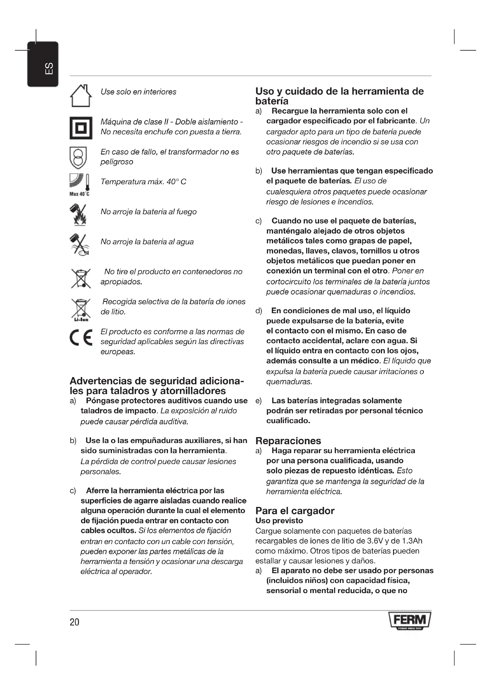 Use solo en interiores Máquina de clase II - Doble aislamiento - No necesita enchufe con puesta a tierra. En caso de fallo, el transformador no es peligroso Temperatura máx. 40° C No arroje la batería al fuego No arroje la batería al agua No tire el producto en contenedores no apropiados. Recogida selectiva de la batería de iones de litio. El producto es conforme a las normas de seguridad aplicables según las directivas europeas. Advertencias de seguridad adiciona- les para taladros y atornilladores a) Póngase protectores auditivos cuando use taladros de impacto. La exposición al ruido puede causar pérdida auditiva. b) Use la o las empuñaduras auxiliares, si han sido suministradas con la herramienta. La pérdida de control puede causar lesiones personales. c) Aferre la herramienta eléctrica por las superficies de agarre aisladas cuando realice alguna operación durante la cual el elemento de fijación pueda entrar en contacto con cables ocultos. Si los elementos de fijación entran en contacto con un cable con tensión, pueden exponer las partes metálicas de la herramienta a tensión y ocasionar una descarga eléctrica al operador. Uso y cuidado de la herramienta de batería a) Recargue la herramienta solo con el cargador especificado por el fabricante. Un cargador apto para un tipo de batería puede ocasionar riesgos de incendio si se usa con otro paquete de baterías. b) Use herramientas que tengan especificado el paquete de baterías. El uso de cualesquiera otros paquetes puede ocasionar riesgo de lesiones e incendios. c) Cuando no use el paquete de baterías, manténgalo alejado de otros objetos metálicos tales como grapas de papel, monedas, llaves, clavos, tornillos u otros objetos metálicos que puedan poner en conexión un terminal con el otro. Poner en cortocircuito los terminales de la batería juntos puede ocasionar quemaduras o incendios. d) En condiciones de mal uso, el líquido puede expulsarse de la batería, evite el contacto con el mismo. En caso de contacto accidental, aclare con agua. Si el líquido entra en contacto con los ojos, además consulte a un médico. El líquido que expulsa la batería puede causar irritaciones o quemaduras. e) Las baterías integradas solamente podrán ser retiradas por personal técnico cualificado. Reparaciones a) Haga reparar su herramienta eléctrica por una persona cualificada, usando solo piezas de repuesto idénticas. Esto garantiza que se mantenga la seguridad de la herramienta eléctrica. Para el cargador Uso previsto Cargue solamente con paquetes de baterías recargables de iones de litio de 3.6V y de 1.3Ah como máximo. Otros tipos de baterías pueden estallar y causar lesiones y daños. a) El aparato no debe ser usado por personas (incluidos niños) con capacidad física, sensorial o mental reducida, o que no21