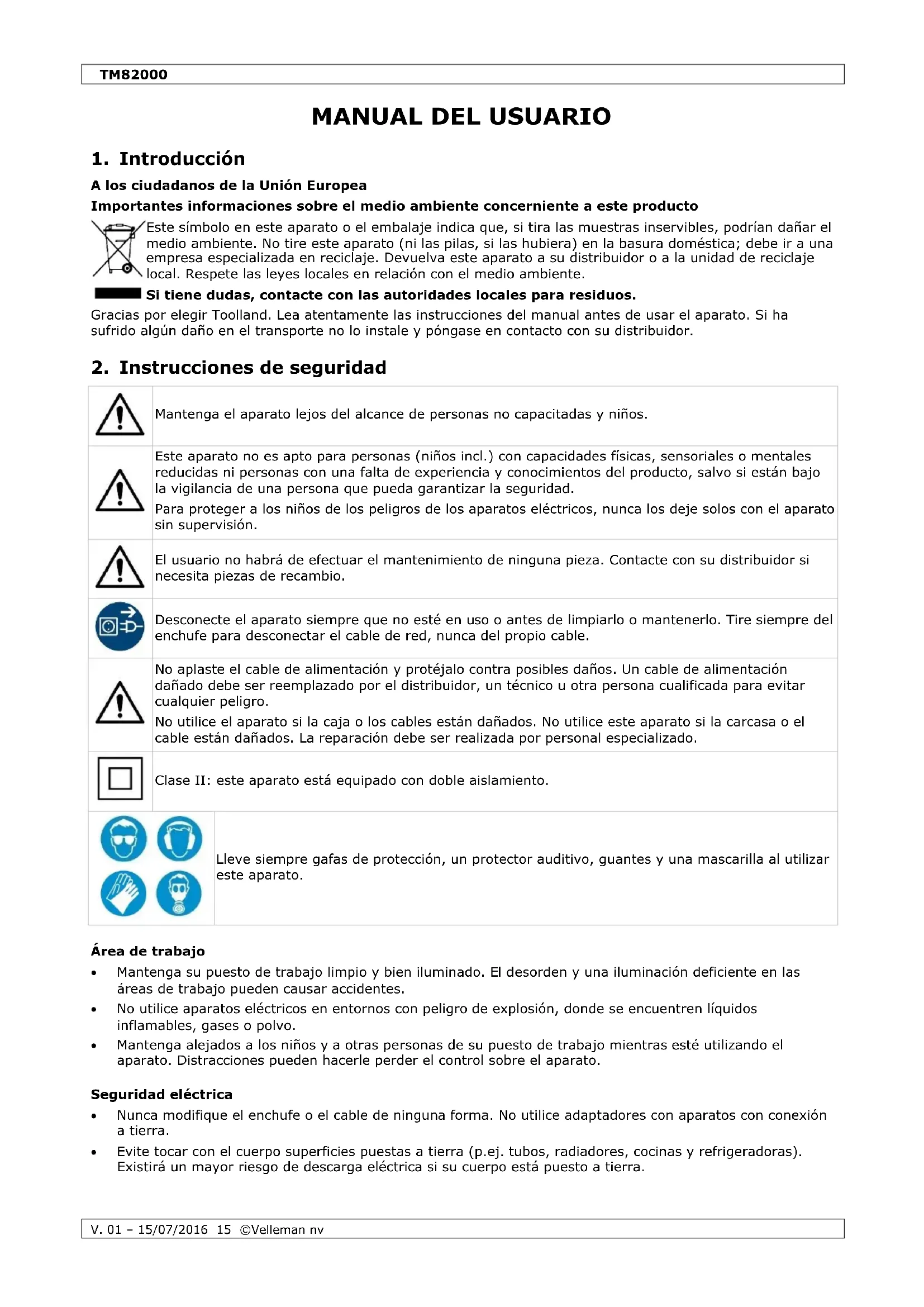 Utilice este aparato solo con los accesos originales. Velleman NV no sera responsable de daños ni lesiones causados por un uso (indebido) de este aparato. Para más información sobre este producto y la version másrecente de este manual del usuario, visite nuestra頁a www.toolland.eu. Se pueda modifier las specifications y el contenido de este manual sin previo avis.