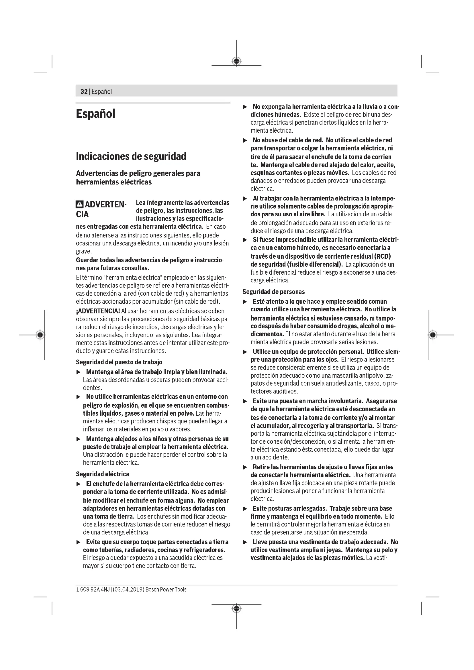 Récipient d’eau sous pression 2 609 390 308 Adaptateur G 1/2" 2 608 598 043 Aspirateur eau et poussière GAS 35MAFC Aspirateur eau et poussière GAS 55MAFC Service après-vente et conseil utilisateurs Notre Service après-vente répond à vos questions concer- nant la réparation et l’entretien de votre produit et les pièces de rechange. Vous trouverez des vues éclatées et des infor- mations sur les pièces de rechange sur le site : www.bosch- pt.com L’équipe de conseil utilisateurs Bosch se tient à votre dispo- sition pour répondre à vos questions concernant nos pro- duits et leurs accessoires. Pour toute demande de renseignement ou commande de pièces de rechange, précisez impérativement la référence à 10chiffres figurant sur l’étiquette signalétique du produit. France Réparer un outil Bosch n’a jamais été aussi simple, et ce, en moins de 5 jours, grâce à SAV DIRECT, notre formulaire de retour en ligne que vous trouverez sur notre site internet www.bosch-pt.fr à la rubrique Services. Vous y trouverez également notre boutique de pièces déta- chées en ligne où vous pouvez passer directement vos com- mandes. Vous êtes un utilisateur, contactez : Le Service Clientèle Bosch Outillage Electroportatif Tel. : 0811 360122 (coût d'une communication locale) E-Mail : sav.outillage-electroportatif@fr.bosch.com Vous êtes un revendeur, contactez : Robert Bosch (France) S.A.S. Service Après-Vente Electroportatif 126, rue de Stalingrad 93705 DRANCY Cédex Tel. : (01) 43119006 E-Mail : sav-bosch.outillage@fr.bosch.com Belgique, Luxembourg Tel. : +32 2 588 0589 Fax : +32 2 588 0595 E-Mail : outillage.gereedschap@be.bosch.com Suisse Passez votre commande de pièces détachées directement en ligne sur notre site www.bosch-pt.com/ch/fr. Tel. : (044) 8471512 Fax : (044) 8471552 E-Mail : Aftersales.Service@de.bosch.com Élimination des déchets L’outil électroportatif, le support de forage, les accessoires et les emballages doivent être rapportés à un centre de recy- clage respectueux de l’environnement. Ne jetez pas les outils électroportatifs avec les ordures ménagères! Seulement pour les pays de l’UE : Conformément à la directive européenne 2012/19/UE rela- tive aux déchets d’équipements électriques et électroniques et sa mise en vigueur conformément aux législations natio- nales, les outils électroportatifs dont on ne peut plus se ser- vir doivent être isolés et suivre une voie de recyclage appro- priée. Bosch Power Tools 1 609 92A 4NJ | (03.04.2019)32 | Español Español Indicaciones de seguridad Advertencias de peligro generales para herramientas eléctricas ADVERTEN- CIA Lea íntegramente las advertencias de peligro, las instrucciones, las ilustraciones y las especificacio- nes entregadas con esta herramienta eléctrica. En caso de no atenerse a las instrucciones siguientes, ello puede ocasionar una descarga eléctrica, un incendio y/o una lesión grave. Guardar todas las advertencias de peligro e instruccio- nes para futuras consultas. El término "herramienta eléctrica" empleado en las siguien- tes advertencias de peligro se refiere a herramientas eléctri- cas de conexión a la red (con cable de red) y a herramientas eléctricas accionadas por acumulador (sin cable de red). ¡ADVERTENCIA! Al usar herramientas eléctricas se deben observar siempre las precauciones de seguridad básicas pa- ra reducir el riesgo de incendios, descargas eléctricas y le- siones personales, incluyendo las siguientes. Lea íntegra- mente estas instrucciones antes de intentar utilizar este pro- ducto y guarde estas instrucciones. Seguridad del puesto de trabajo u Mantenga el área de trabajo limpia y bien iluminada. Las áreas desordenadas u oscuras pueden provocar acci- dentes. u No utilice herramientas eléctricas en un entorno con peligro de explosión, en el que se encuentren combus- tibles líquidos, gases o material en polvo. Las herra- mientas eléctricas producen chispas que pueden llegar a inflamar los materiales en polvo o vapores. u Mantenga alejados a los niños y otras personas de su puesto de trabajo al emplear la herramienta eléctrica. Una distracción le puede hacer perder el control sobre la herramienta eléctrica. Seguridad eléctrica u El enchufe de la herramienta eléctrica debe corres- ponder a la toma de corriente utilizada. No es admisi- ble modificar el enchufe en forma alguna. No emplear adaptadores en herramientas eléctricas dotadas con una toma de tierra. Los enchufes sin modificar adecua- dos a las respectivas tomas de corriente reducen el riesgo de una descarga eléctrica. u Evite que su cuerpo toque partes conectadas a tierra como tuberías, radiadores, cocinas y refrigeradores. El riesgo a quedar expuesto a una sacudida eléctrica es mayor si su cuerpo tiene contacto con tierra. u No exponga la herramienta eléctrica a la lluvia o a con- diciones húmedas. Existe el peligro de recibir una des- carga eléctrica si penetran ciertos líquidos en la herra- mienta eléctrica. u No abuse del cable de red. No utilice el cable de red para transportar o colgar la herramienta eléctrica, ni tire de él para sacar el enchufe de la toma de corrien- te. Mantenga el cable de red alejado del calor, aceite, esquinas cortantes o piezas móviles. Los cables de red dañados o enredados pueden provocar una descarga eléctrica. u Al trabajar con la herramienta eléctrica a la intempe- rie utilice solamente cables de prolongación apropia- dos para su uso al aire libre. La utilización de un cable de prolongación adecuado para su uso en exteriores re- duce el riesgo de una descarga eléctrica. u Si fuese imprescindible utilizar la herramienta eléctri- ca en un entorno húmedo, es necesario conectarla a través de un dispositivo de corriente residual (RCD) de seguridad (fusible diferencial). La aplicación de un fusible diferencial reduce el riesgo a exponerse a una des- carga eléctrica. Seguridad de personas u Esté atento a lo que hace y 