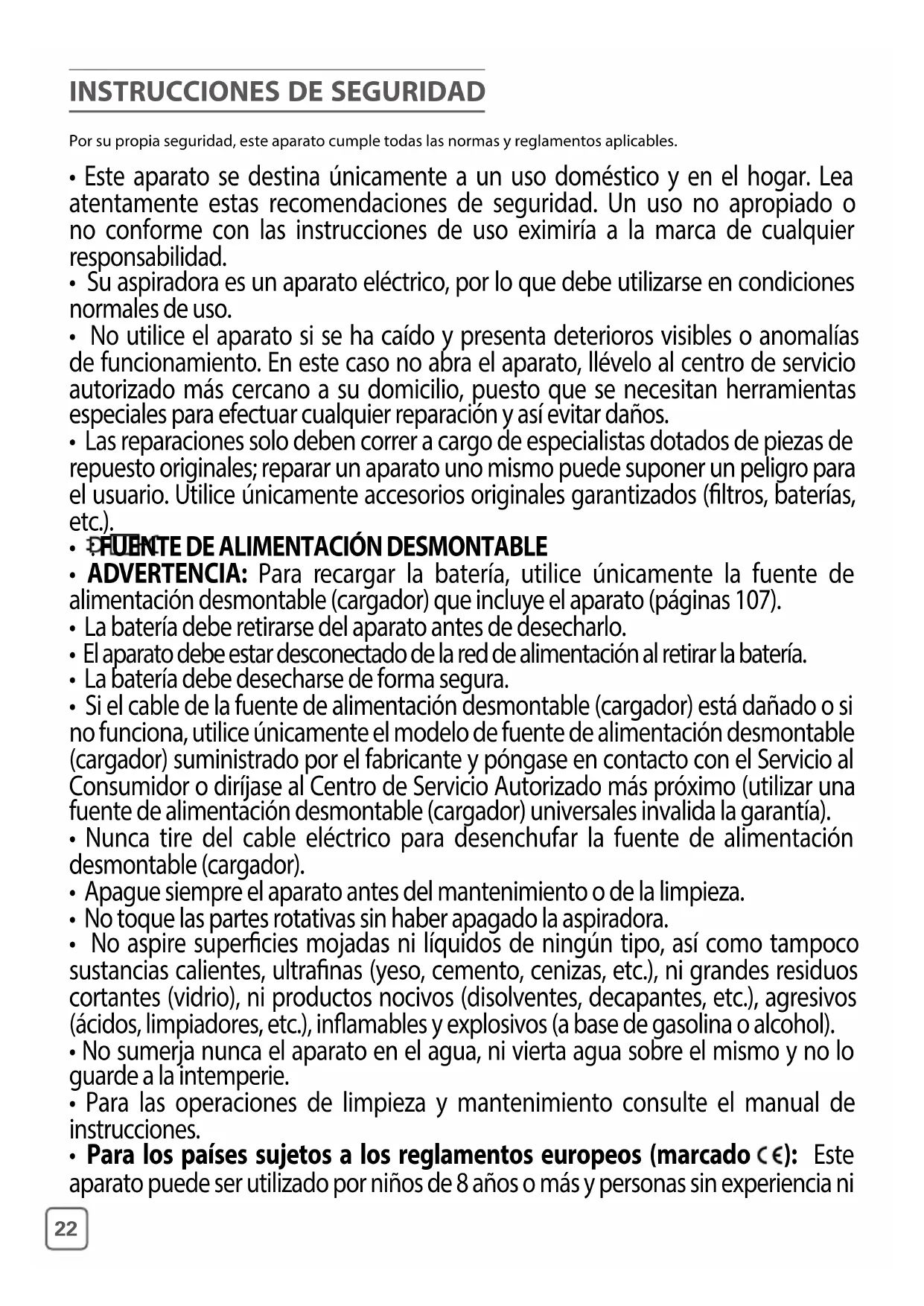 conocimientos o cuyas capacidades físicas, sensoriales o mentales son reducidas, siempre que hayan sido formadas e informadas en lo relativo a un uso seguro y conozcan los riesgos a los que se exponen. Los niños no deben jugar con el aparato. La limpieza y mantenimiento a cargo del usuario no deben correr a cargo de niños sin vigilancia. Mantenga el aparato y la fuente de alimentación desmontable (cargador) fuera del alcance de los niños menores de 8 años.