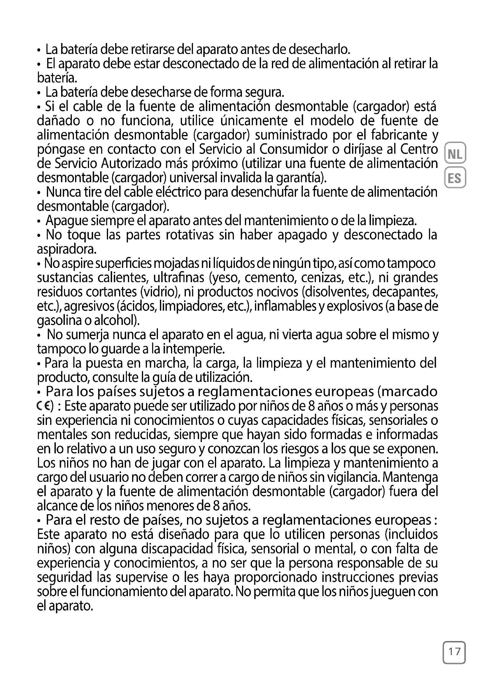 - Su aspiradora es un aparato eléctrico, por lo que debe utilizarse en condiciones normales de uso. No sostenga la boquilla a la altura de los ojos o las orejas.