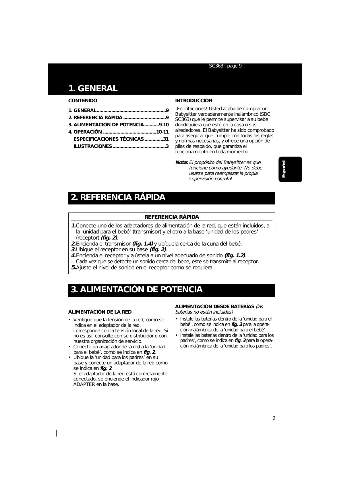 ILUSTRACIONES ........................................3 ¡Felicitaciones! Usted acaba de comprar un Babysitter verdaderamente inalámbrico (SBC SC363) que le permite supervisar a su bebé dondequiera que esté en la casa o sus alrededores. El Babysitter ha sido comprobado para asegurar que cumple con todas las reglas y normas necesarias, y ofrece una opción de pilas de respaldo, que garantiza el funcionamiento en toda momento. Español Nota: El propósito del Babysitter es que funcione como ayudante. No debe usarse para reemplazar la propia supervisión parental.