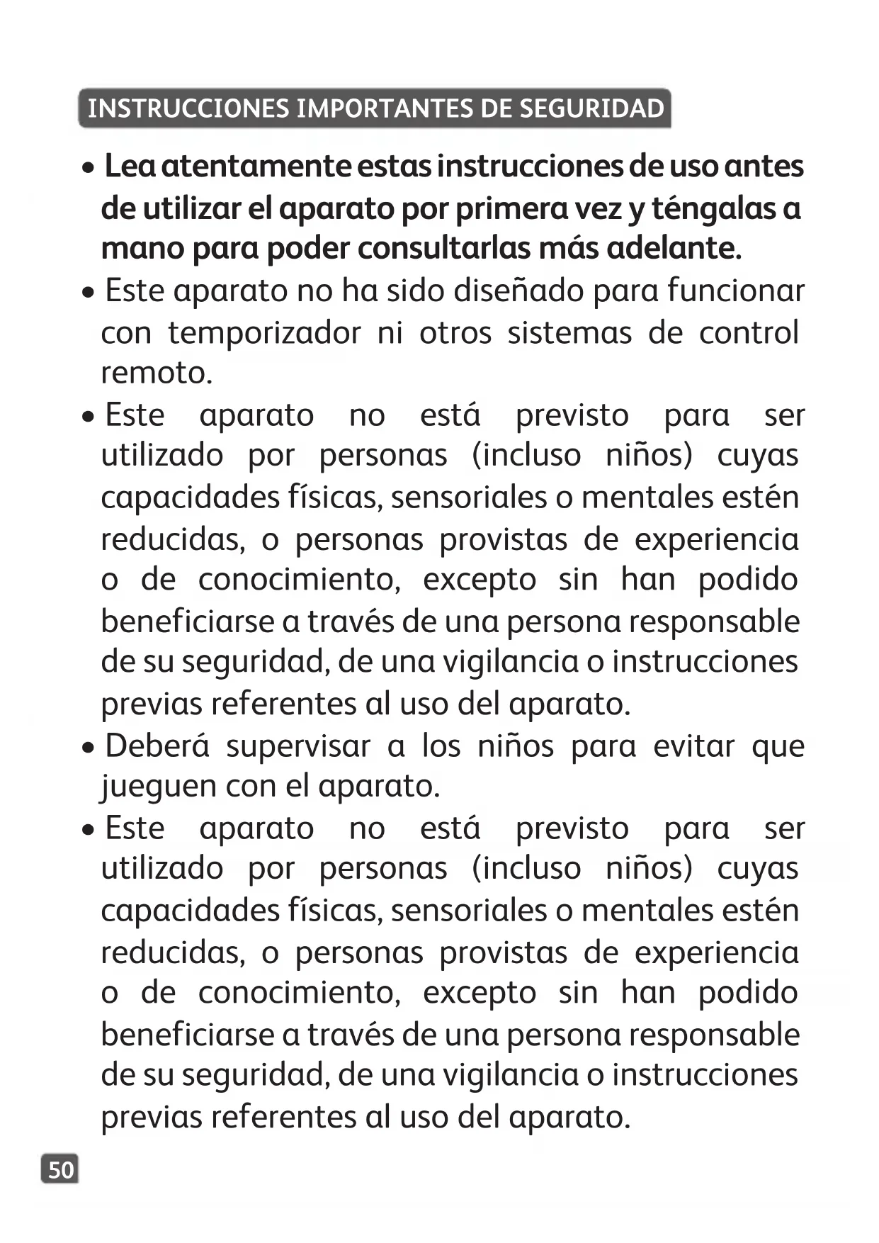 - Este aparato no está previsto para ser utilizado por personas (incluso niños) cuyas capacidades físicas, sensoriales o mentales estén reducidas, o personas provistas de experiencia o de conocimiento, excepto sin han podido beneficiarse a través de una persona responsable de su seguridad, de una vigilancia o instrucciones previas referentes al uso del aparato.51