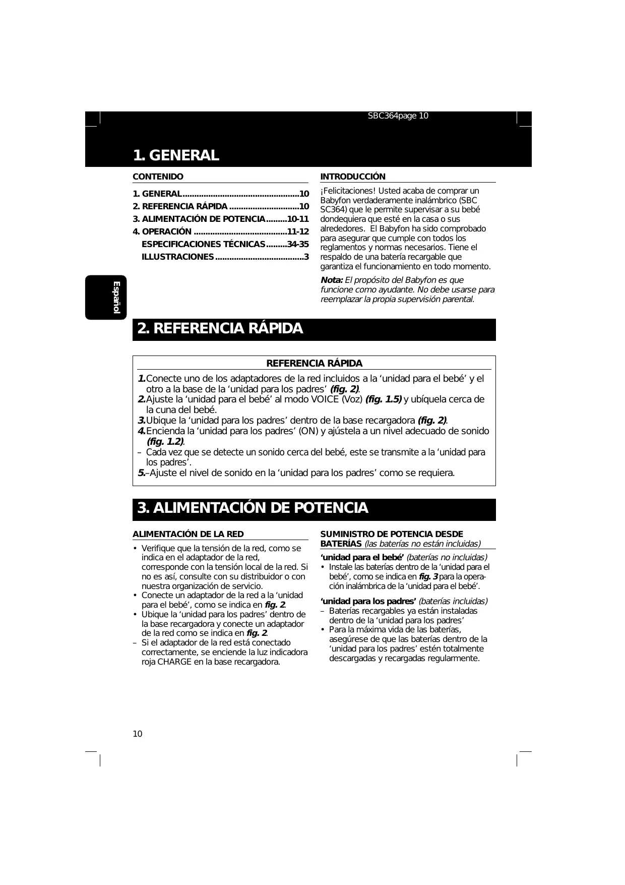ILLUSTRACIONES ......................................3 ¡Felicitaciones! Usted acaba de comprar un Babyfon verdaderamente inalámbrico (SBC SC364) que le permite supervisar a su bebé dondequiera que esté en la casa o sus alrededores. El Babyfon ha sido comprobado para asegurar que cumple con todos los reglamentos y normas necesarios. Tiene el respaldo de una batería recargable que garantiza el funcionamiento en todo momento. Español Nota: El propósito del Babyfon es que funcione como ayudante. No debe usarse para reemplazar la propia supervisión parental.