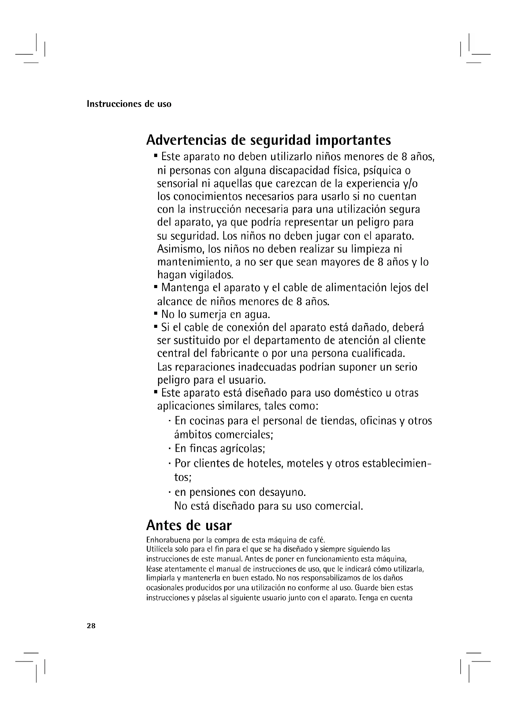 - Este aparato está diseñado para uso doméstico u otras aplicaciones similares, tales como: ⋅ En cocinas para el personal de tiendas, oficinas y otros ámbitos comerciales; ⋅ En fincas agrícolas; ⋅ Por clientes de hoteles, moteles y otros establecimien- tos; ⋅ en pensiones con desayuno. No está diseñado para su uso comercial. Antes de usar Enhorabuena por la compra de esta máquina de café. Utilícela solo para el fin para el que se ha diseñado y siempre siguiendo las instrucciones de este manual. Antes de poner en funcionamiento esta máquina, léase atentamente el manual de instrucciones de uso, que le indicará cómo utilizarla, limpiarla y mantenerla en buen estado. No nos responsabilizamos de los daños ocasionales producidos por una utilización no conforme al uso. Guarde bien estas instrucciones y páselas al siguiente usuario junto con el aparato. Tenga en cuenta Instrucciones de uso29