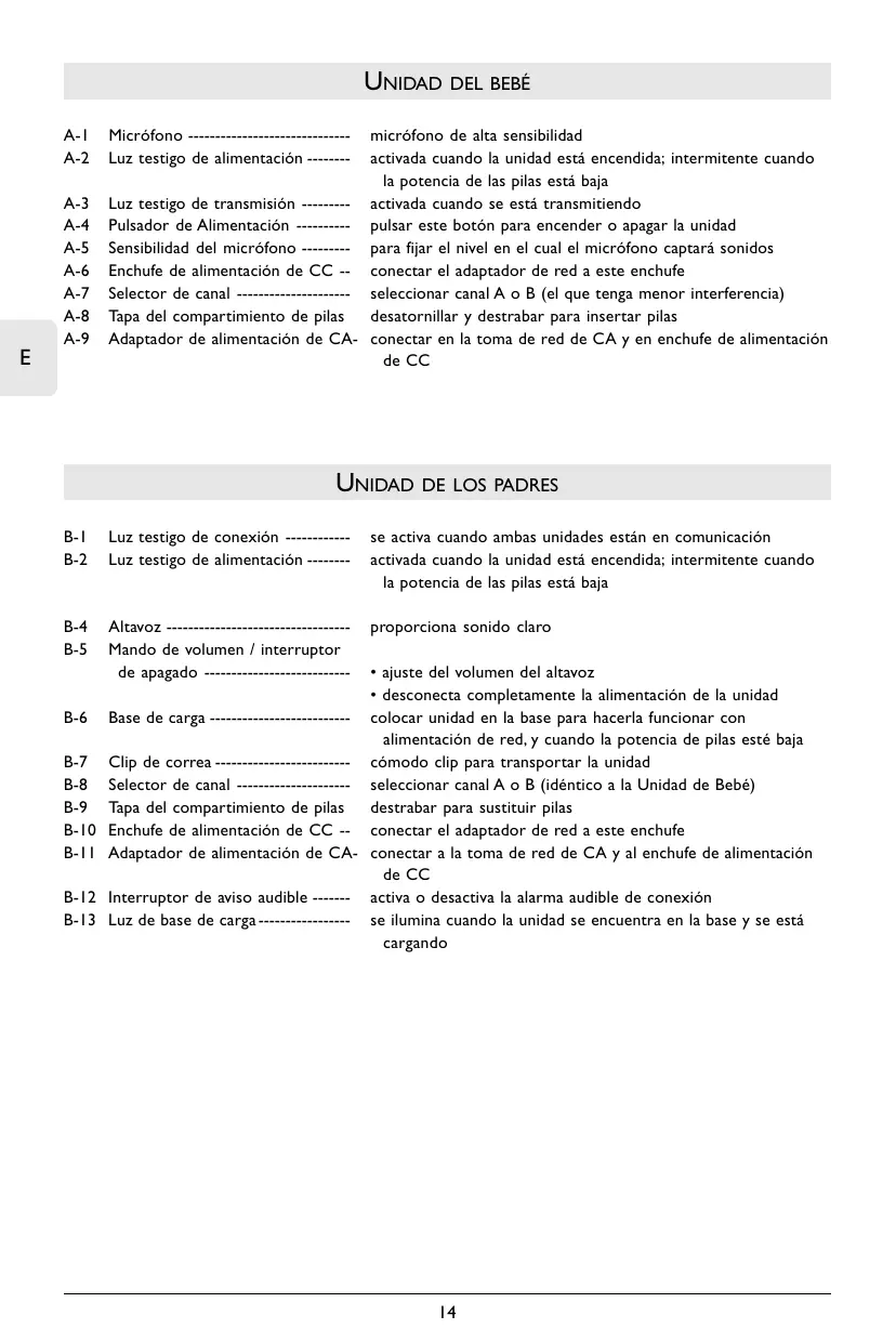 Unidad del Bebé Conectar el adaptador de alimentación de CA (A-9) a una toma de red de CA, y luego conectar el cable al enchufe de alimentación de CC (A-6) de la unidad de Bebé. Si desea usar pilas, retirar la tapa del compartimiento de pilas (A-8) usando un destornillador. Insertar cuatro pilas de 1,5V tipo AA (no incluidas; recomendamos pilas tipo alcalinas no recargables de Philips), teniendo en cuenta la configuración de + y – indicado en el compartimiento. Colocar de nuevo la tapa y atornillar. La unidad de Bebé funciona sin cables durante unas 30 horas (con pilas nuevas). La luz testigo de alimentación roja “POWER” (A-2) parpadea cuando el nivel de potencia de las pilas es está bajo. Si ocurriera ésto instalar nuevas pilas. Nota: Para desconectar la unidad de Bebé completamente, pulsar el botón de alimentación POWER (A-4). Unidad de Padres La unidad de Padres funciona con un bloque de pilas secas recargables. Este bloque ya viene instalado, sin embargo primero debe ser cargado por lo menos durante 14 horas de la manera siguiente antes de poder usar la unidad fuera de la base de carga: