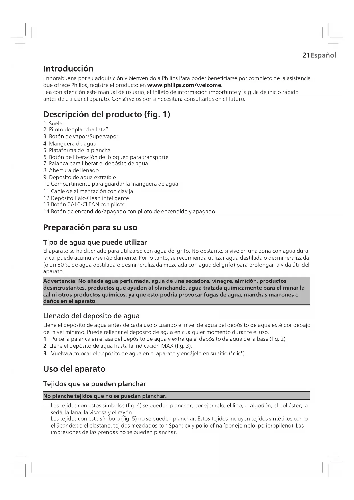 1 Suela 2 Piloto de “plancha lista” 3 Botón de vapor/Supervapor 4 Manguera de agua 5 Plataforma de la plancha 6 Botón de liberación del bloqueo para transporte 7 Palanca para liberar el depósito de agua 8 Abertura de llenado 9 Depósito de agua extraíble 10 Compartimento para guardar la manguera de agua 11 Cable de alimentación con clavija 12 Depósito Calc-Clean inteligente 13 Botón CALC-CLEAN con piloto 14 Botón de encendido/apagado con piloto de encendido y apagado Preparación para su uso Tipo de agua que puede utilizar El aparato se ha diseñado para utilizarse con agua del grifo. No obstante, si vive en una zona con agua dura, la cal puede acumularse rápidamente. Por lo tanto, se recomienda utilizar agua destilada o desmineralizada )o un 50% de agua destilada o desmineralizada mezclada con agua del grifo( para prolongar la vida útil del aparato. Advertencia: No añada agua perfumada, agua de una secadora, vinagre, almidón, productos desincrustantes, productos que ayuden al planchando, agua tratada químicamente para eliminar la cal ni otros productos químicos, ya que esto podría provocar fugas de agua, manchas marrones o daños en el aparato. Llenado del depósito de agua Llene el depósito de agua antes de cada uso o cuando el nivel de agua del depósito de agua esté por debajo del nivel mínimo. Puede rellenar el depósito de agua en cualquier momento durante el uso. 1 Pulse la palanca en el asa del depósito de agua y extraiga el depósito de agua de la base )g. 2(. 2 Llene el depósito de agua hasta la indicación MAX )g. 3(. 3 Vuelva a colocar el depósito de agua en el aparato y encájelo en su sitio )"clic"(. Uso del aparato Tejidos que se pueden planchar No planche tejidos que no se puedan planchar. - Los tejidos con estos símbolos )g. 4( se pueden planchar, por ejemplo, el lino, el algodón, el poliéster, la seda, la lana, la viscosa y el rayón. - Los tejidos con este símbolo )g. 5( no se pueden planchar. Estos tejidos incluyen tejidos sintéticos como el Spandex o el elastano, tejidos mezclados con Spandex y poliolena )por ejemplo, polipropileno(. Las impresiones de las prendas no se pueden planchar.22 Español Planchado 1 Coloque el aparato sobre una supercie plana y estable. Nota: Para garantizar un planchado seguro, le recomendamos que coloque siempre la base en una tabla de planchar estable o en el suelo. 2 Asegúrese de que haya suciente agua en el depósito de agua. 3 Extraiga la manguera de agua del compartimento de almacenamiento. 4 Conecte la clavija a un enchufe con toma de tierra y pulse el botón de encendido/apagado para encender el aparato )g. 6(. Espere hasta el piloto de “plancha lista” se ilumine continuamente )g.7(. Este proceso tarda unos 2minutos. 5 Pulse el botón de liberación del bloqueo para transporte a n de desbloquear la plancha de su plataforma )g. 8(. 6 Mantenga pulsado el botón de vapor para comenzar a planchar )g. 9(. Nota: Al empezar la sesión de planchado y especialmente durante el primer uso del botón de vapor, este puede tardar más de 30 segundos en salir del aparato. Nota: La bomba se activa cada vez que pulsa el botón de vapor. Produce un sonido vibratorio suave. Si no hay agua en el depósito, el sonido de la bomba es más fuerte. 7 Para obtener los mejores resultados, después de planchar con vapor, realice las últimas pasadas sin vapor. Nota: En caso de que no suelte el botón a tiempo y levante la plancha hasta la base, es posible que siga saliendo vapor, lo que es normal. Para evitarlo, le recomendamos que deje la plancha sobre la tabla mientras reorganiza la prenda de vestir. Advertencia: No dirija nunca el vapor hacia las personas. Función de modo MAX Para obtener un vapor más potente, puede utilizar el modo de vapor MAX, que resulta seguro en todos los tejidos aptos para planchar. Para tejidos como el algodón, la tela vaquera o el lino, le recomendamos que utilice el modo de vapor MAX. 1 Mantenga pulsado el botón de encendido durante 2 segundos hasta que el piloto se ilumine en blanco. 2 Para desactivar el modo MAX, mantenga pulsado el botón de encendido durante 2 segundos hasta que el piloto se ilumine en azul. Función golpe de vapor 1 Pulse el botón de vapor dos veces rápidamente para liberar un potente golpe de vapor durante 3segundos )g. 10(. Nota: Se recomienda usar la función de golpe de vapor solo para arrugas difíciles. Planchado vertical Advertencia: La plancha libera vapor caliente. Nunca intente eliminar las arrugas de una prenda
