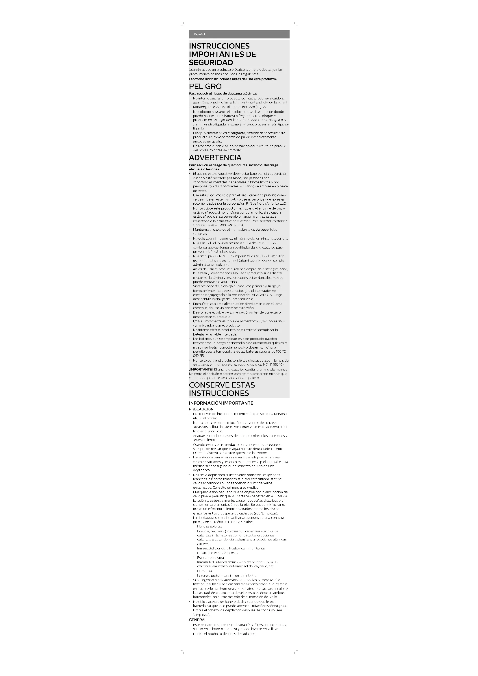 Limpie el producto después de cada uso.- Este aparato no tiene otras partes que requieran servicio por parte del usuario. Para asistencia llame al 1-800-243-7884 (en EE. UU. solamente) o al 1-886-800-9311 (en Canadá solamente). Introducción Enhorabuena por la adquisición de este producto, y bienvenido a Philips. Para sacar el mayor partido a la asistencia que Philips le ofrece, registre el producto en www.philips.com/welcome. Características (Fig. 1) 1 Mango 2 Luces indicadoras de velocidad (I y II) 3 Botón de encendido/apagado 4 Indicador de batería 5 Botón de liberación 6 Toma para clavija pequeña 7 Cabezal depilador 8 Luz incorporada 9 Cabezal masajeador 10 Cabezal facial 11 Cabezal para zonas delicadas 12 Cabezal para sistema de estiramiento de la piel 13 Cabezal de afeitado 14 Lámina 15 Recortadoras 16 Peine para el cabezal de afeitado 17 Cabezal recortador 18 Peine del cabezal recortador 19 Unidad de acoplamiento 20Cabezal de masaje corporal 21 Cepillo de exfoliación corporal 22 Tapa de protección del cepillo de exfoliación corporal 23 Cable de alimentación No se muestra: Cepillo de limpieza, Funda Carga
