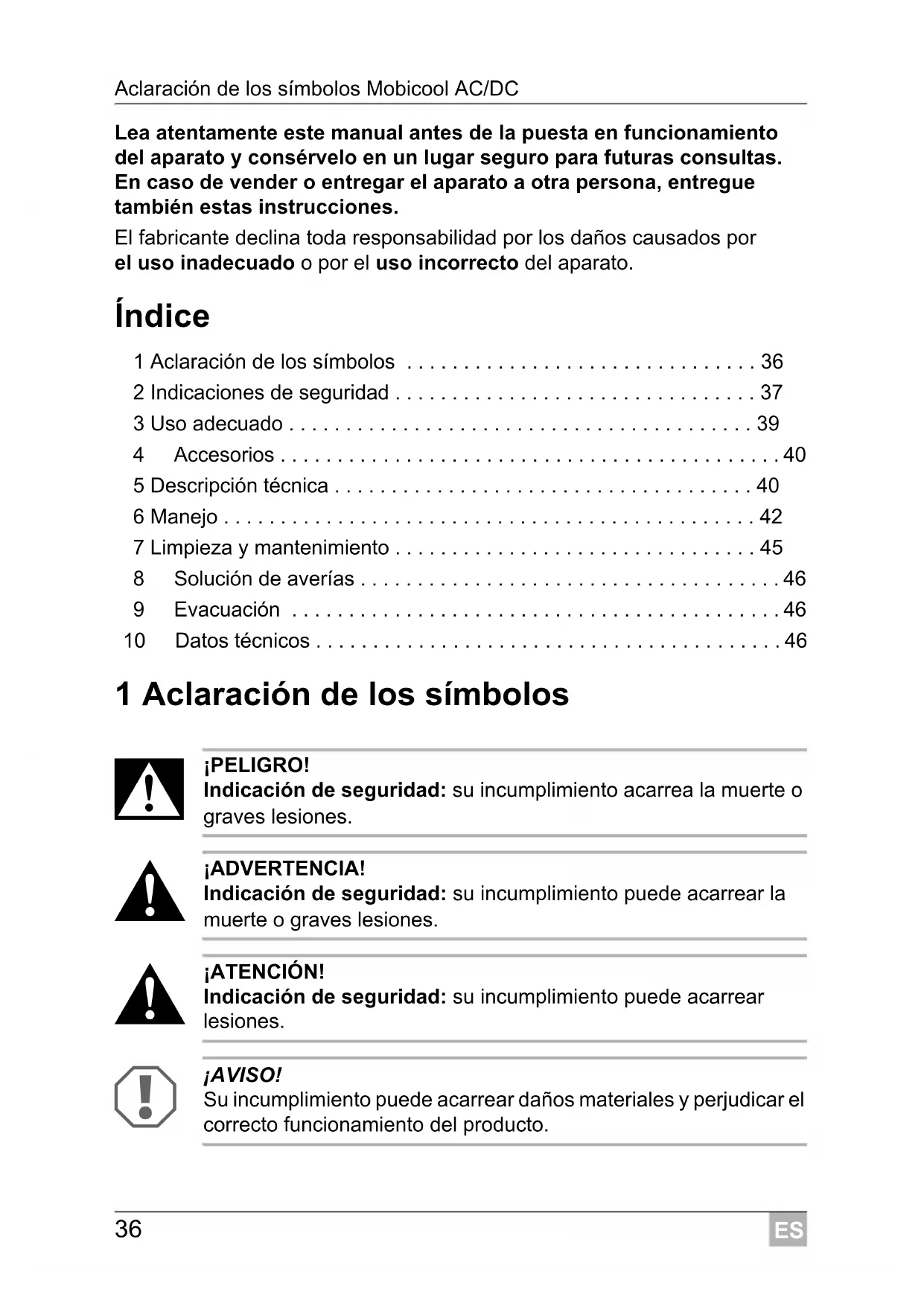 - Lea atentamente este manual antes de la puesta en funcionamiento del aparato y consérvelo en un lugar seguro para futuras consultas. En caso de vender o entregar el aparato a otra persona, entregue también estas instrucciones. El fabricante declina toda responsabilidad por los daños causados por el uso inadecuado o por el uso incorrecto del aparato. Índice 1 Aclaración de los símbolos p. 36