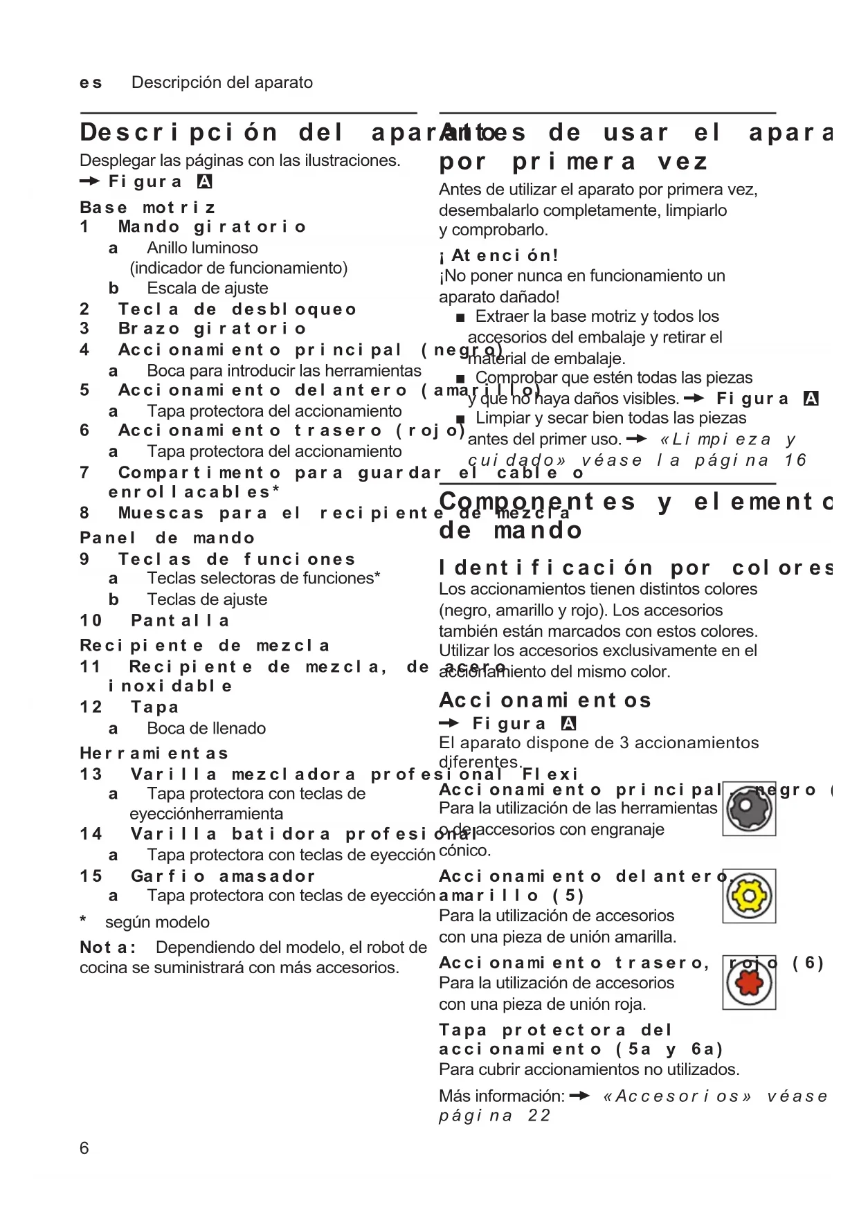 - Accesorios es Descripción del aparato Descripción del aparato Desplegar las páginas con las ilustraciones. X Figura A Base motriz 1 Mando giratorio a Anillo luminoso (indicador de funcionamiento) b Escala de ajuste 2 Tecla de desbloqueo 3 Brazo giratorio 4 Accionamiento principal (negro) a Boca para introducir las herramientas 5 Accionamiento delantero (amarillo) a Tapa protectora del accionamiento 6 Accionamiento trasero (rojo) a Tapa protectora del accionamiento 7 Compartimento para guardar el cable o enrollacables* 8 Muescas para el recipiente de mezcla Panel de mando 9 Teclas de funciones a Teclas selectoras de funciones* b Teclas de ajuste 10 Pantalla Recipiente de mezcla 11 Recipiente de mezcla, de acero inoxidable 12 Tapa a Boca de llenado Herramientas 13 Varilla mezcladora profesional Flexi a Tapa protectora con teclas de eyección herramienta 14 Varilla batidora profesional a Tapa protectora con teclas de eyección 15 Garfio amasador a Tapa protectora con teclas de eyección p. 226
