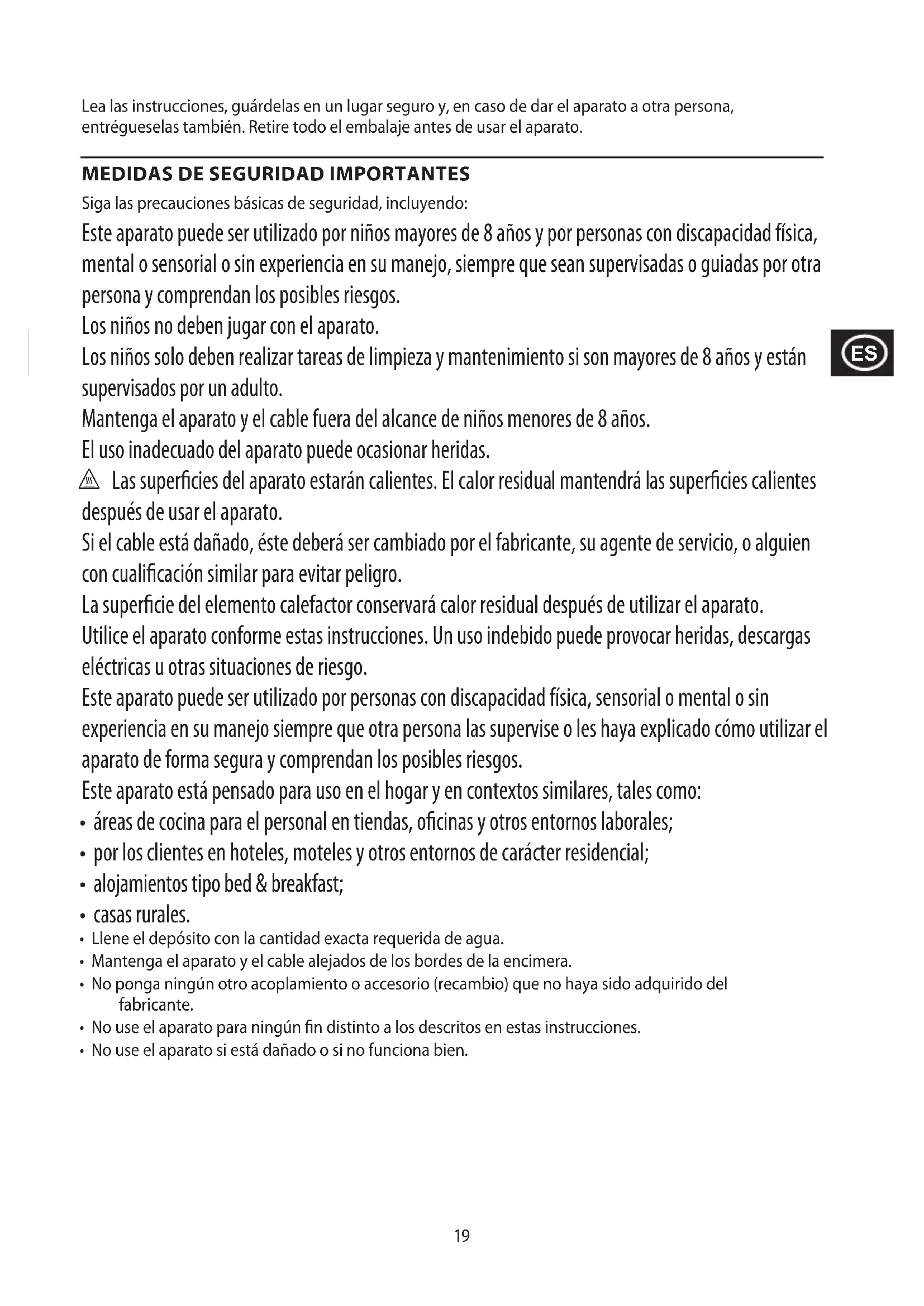 Siga las precauciones básicas de seguridad, incluyendo: Este aparato puede ser utilizado por niños mayores de 8 años y por personas con discapacidad física, mental o sensorial o sin experiencia en su manejo, siempre que sean supervisadas o guiadas por otra persona y comprendan los posibles riesgos. Los niños no deben jugar con el aparato. Los niños solo deben realizar tareas de limpieza y mantenimiento si son mayores de 8 años y están supervisados por un adulto. Mantenga el aparato y el cable fuera del alcance de niños menores de 8 años. El uso inadecuado del aparato puede ocasionar heridas. h Las supercies del aparato estarán calientes. El calor residual mantendrá las supercies calientes después de usar el aparato. Si el cable está dañado, éste deberá ser cambiado por el fabricante, su agente de servicio, o alguien con cualicación similar para evitar peligro. La supercie del elemento calefactor conservará calor residual después de utilizar el aparato. Utilice el aparato conforme estas instrucciones. Un uso indebido puede provocar heridas, descargas eléctricas u otras situaciones de riesgo. Este aparato puede ser utilizado por personas con discapacidad física, sensorial o mental o sin experiencia en su manejo siempre que otra persona las supervise o les haya explicado cómo utilizar el aparato de forma segura y comprendan los posibles riesgos. Este aparato está pensado para uso en el hogar y en contextos similares, tales como: