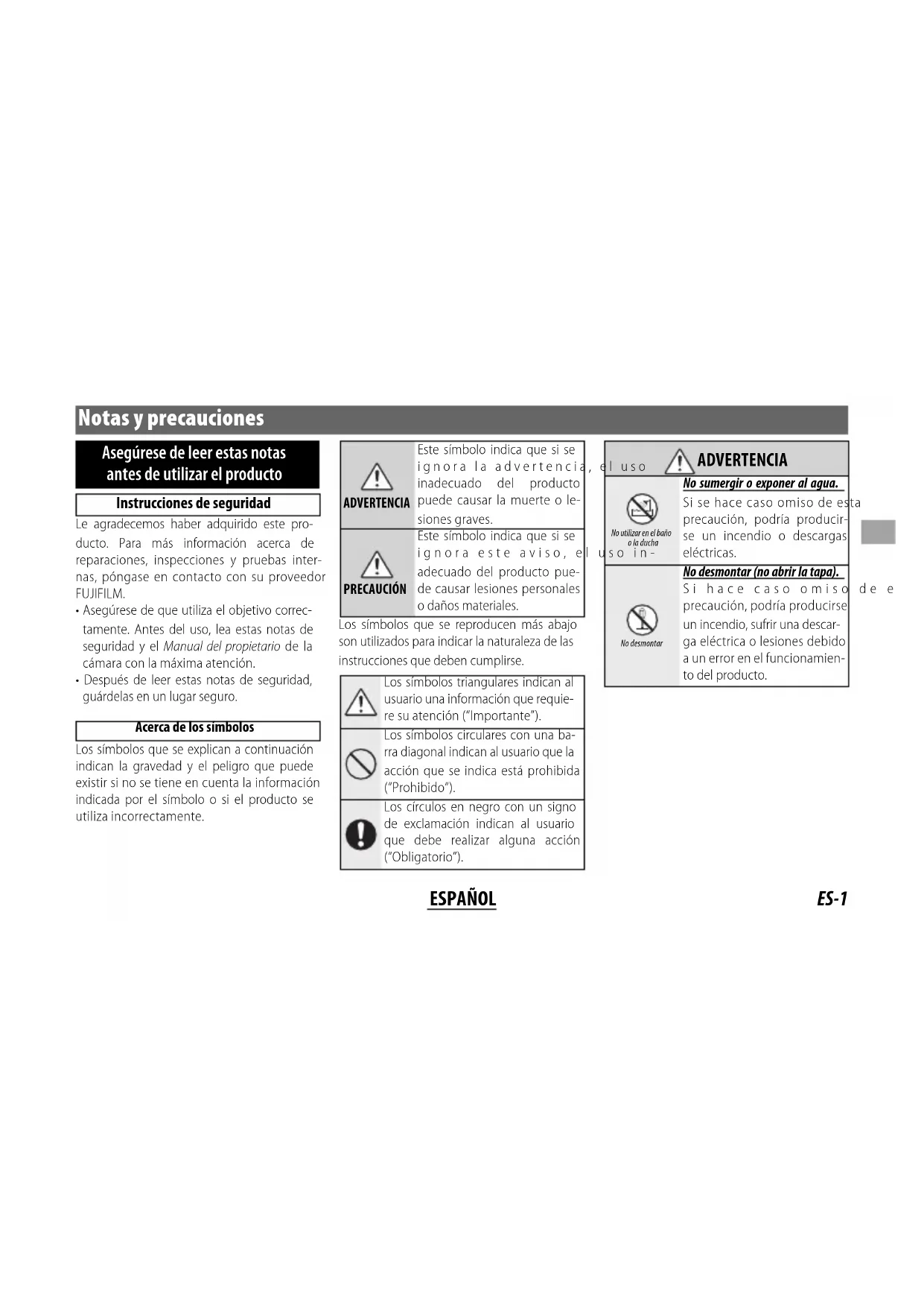 - Objektivdeckel und Sonnenblenden ausgenommen 405 g 540 g Filtergröße ⌀62mm ⌀62mm Q Verbesserungen können zu unangekündigten Änderungen der technischen Daten und des äußeren Erscheinungsbildes führen. Q Aufgrund der Objektivkonstruktion kann die Entfernungsanzeige der Kamera in manchen Fällen von der tatsächlichen Fokussierentfernung abweichen. Benutzen Sie die Entfernungsanzeige nur zur Orientierung.ES-1 ESPAÑOL Notas y precauciones Asegúrese de leer estas notas antes de utilizar el producto Instrucciones de seguridad Le agradecemos haber adquirido este pro-ducto. Para más información acerca de reparaciones, inspecciones y pruebas inter-nas, póngase en contacto con su proveedor FUJIFILM.• Asegúrese de que utiliza el objetivo correc-tamente. Antes del uso, lea estas notas de seguridad y el Manual del propietario de la cámara con la máxima atención.• Después de leer estas notas de seguridad, guárdelas en un lugar seguro. Acerca de los símbolos Los símbolos que se explican a continuación indican la gravedad y el peligro que puede existir si no se tiene en cuenta la información indicada por el símbolo o si el producto se utiliza incorrectamente.ADVERTENCIAEste símbolo indica que si se ignora la advertencia, el uso inadecuado del producto puede causar la muerte o le-siones graves.PRECAUCIÓNEste símbolo indica que si se ignora este aviso, el uso in-adecuado del producto pue-de causar lesiones personales o daños materiales.Los símbolos que se reproducen más abajo son utilizados para indicar la naturaleza de las instrucciones que deben cumplirse.Los símbolos triangulares indican al usuario una información que requie-re su atención (“Importante”).Los símbolos circulares con una ba-rra diagonal indican al usuario que la acción que se indica está prohibida (“Prohibido”).Los círculos en negro con un signo de exclamación indican al usuario que debe realizar alguna acción (“Obligatorio”).