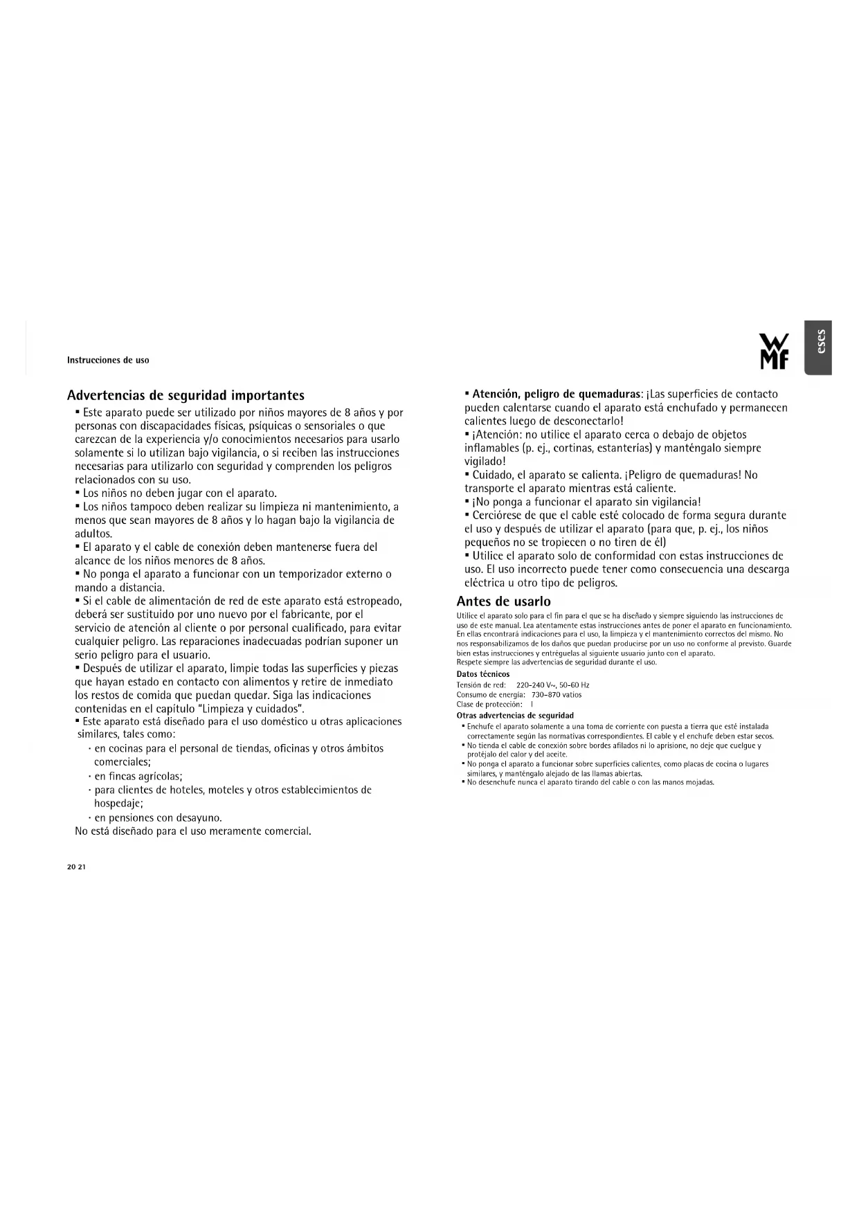 - Utilice el aparato solo de conformidad con estas instrucciones de uso. El uso incorrecto puede tener como consecuencia una descarga eléctrica u otro tipo de peligros. Antes de usarlo Utilice el aparato solo para el fin para el que se ha diseñado y siempre siguiendo las instrucciones de uso de este manual. Lea atentamente estas instrucciones antes de poner el aparato en funcionamiento. En ellas encontrará indicaciones para el uso, la limpieza y el mantenimiento correctos del mismo. No nos responsabilizamos de los daños que puedan producirse por un uso no conforme al previsto. Guarde bien estas instrucciones y entréguelas al siguiente usuario junto con el aparato. Respete siempre las advertencias de seguridad durante el uso. Datos técnicos Tensión de red: 220-240 V~, 50-60 Hz Consumo de energía: 730–870 vatios Clase de protección: I Otras advertencias de seguridad