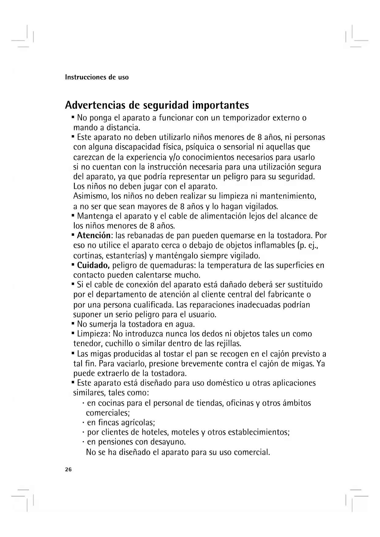 No cubra la rejilla cuando la tostadora está的功能ando. No colque rebanas de pan ni panecillos en la carcasa, podria sobrecalentar la tostadora. - La garantía quedará anulada en caso de uso diferente al dispuesto, Utilización indefinida o una reparación que no haya sido realizada por profesionales y no nos haremos cargo de los días eventuales occasionados. En these cases, las reclamaciones en periodo de garantía también quedarán excluidas.