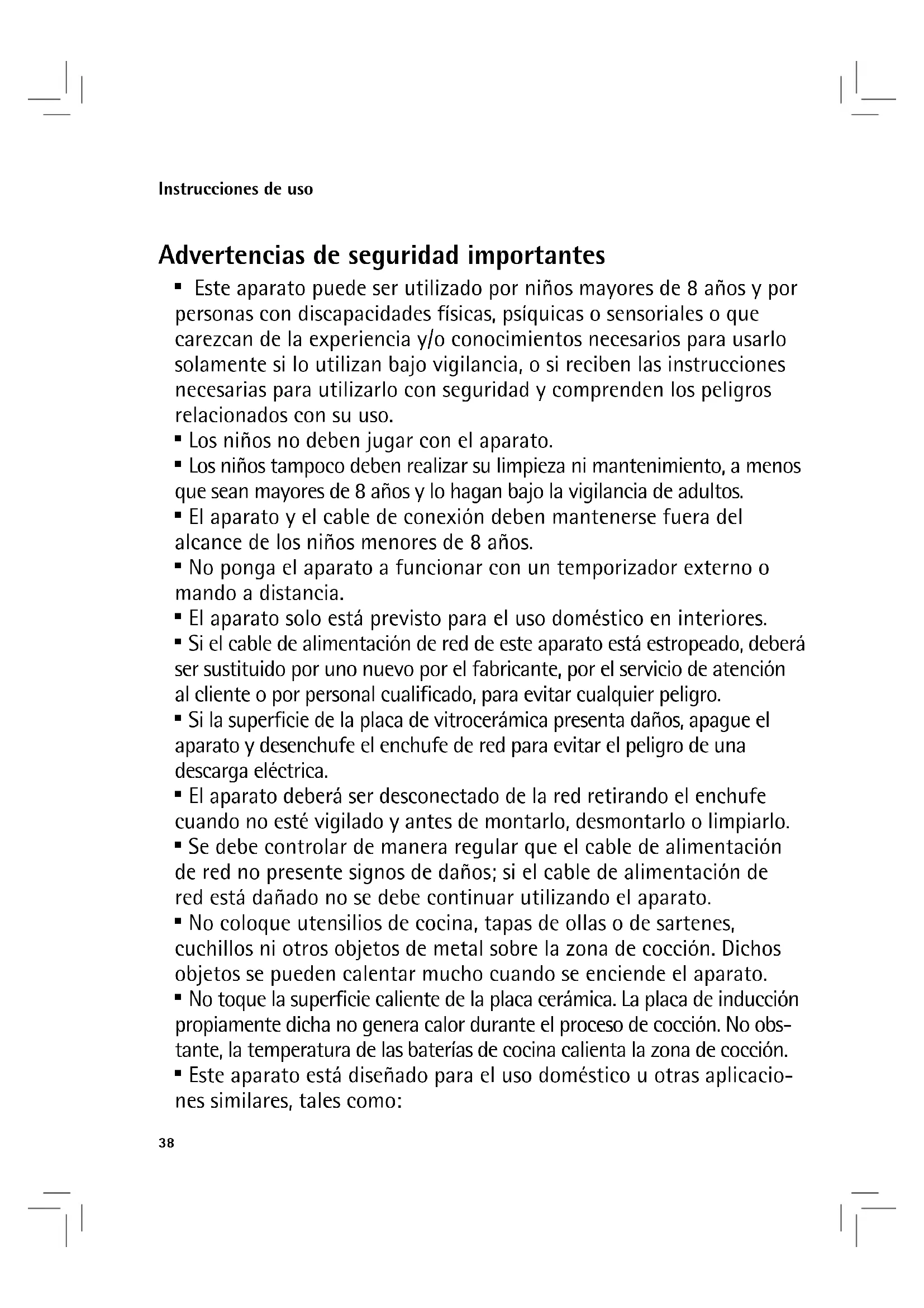 - Este aparato puede ser utilizado por niños mayores de 8 años y por personas con discapacidades físicas, psíquicas o sensoriales o que carezcan de la experiencia y/o conocimientos necesarios para usarlo solamente si lo utilizan bajo vigilancia, o si reciben las instrucciones necesarias para utilizarlo con seguridad y comprenden los peligros relacionados con su uso.