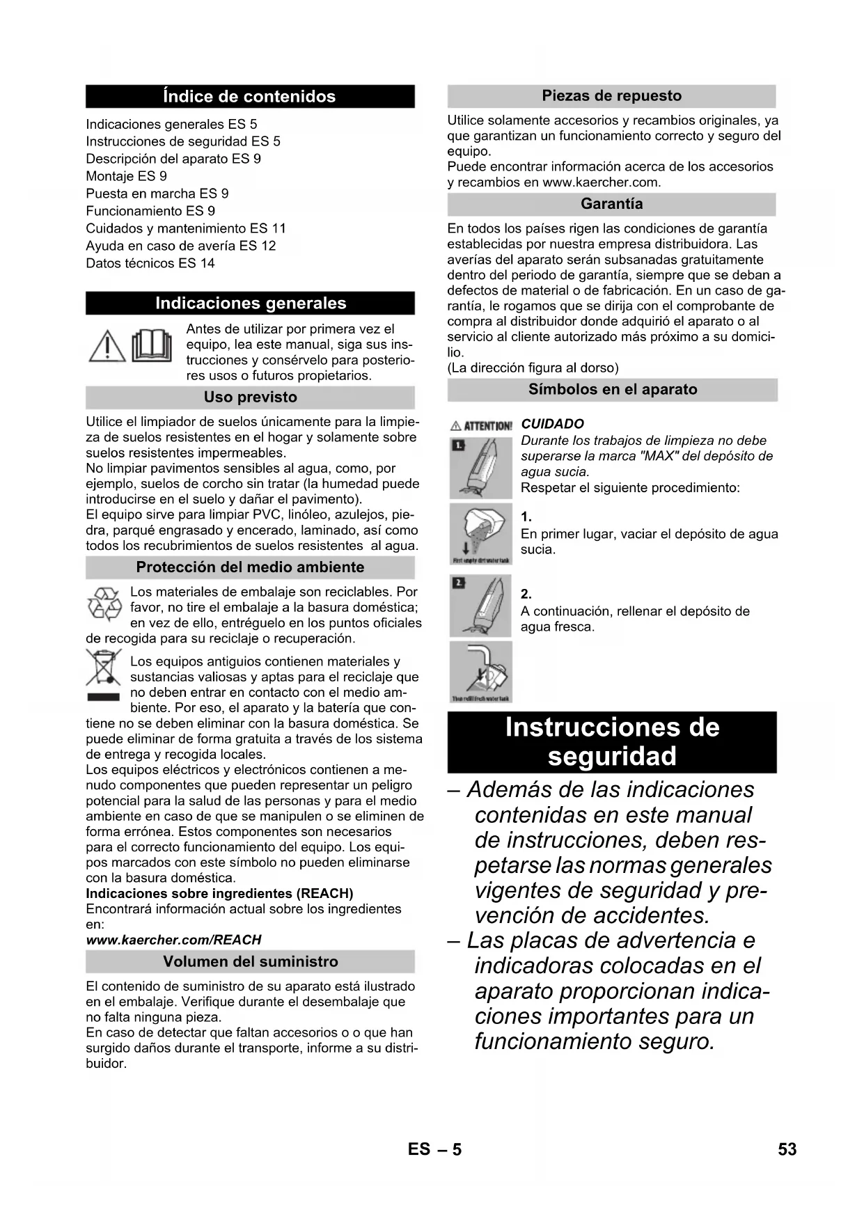 Nominaal vermogen toestel 165 W Accutype Li-ion Bedrijfstijd bij volle acculading ca. 20 min Laadtijd bij lege accu 4 h Uitgangsspanning oplaadappa- raat 30 V Uitgangsstroom laadapparaat 0,6 A Capaciteit Walsomwentelingen per minuut 500 u/min Inhoud Schoonwaterreservoir 400 ml Reinigingsstation 200 ml Afmetingen Gewicht (zonder toebehoren en reinigingsvloeistof) 4,4 kg Lengte 320 mm Breedte 270 mm Hoogte 1220 mm Lengte snoer Oplaadapparaat 1500 mm 52 NL– 5 Antes de utilizar por primera vez el equipo, lea este manual, siga sus ins- trucciones y consérvelo para posterio- res usos o futuros propietarios. Utilice el limpiador de suelos únicamente para la limpie- za de suelos resistentes en el hogar y solamente sobre suelos resistentes impermeables. No limpiar pavimentos sensibles al agua, como, por ejemplo, suelos de corcho sin tratar (la humedad puede introducirse en el suelo y dañar el pavimento). El equipo sirve para limpiar PVC, linóleo, azulejos, pie- dra, parqué engrasado y encerado, laminado, así como todos los recubrimientos de suelos resistentes al agua. Los materiales de embalaje son reciclables. Por favor, no tire el embalaje a la basura doméstica; en vez de ello, entréguelo en los puntos oficiales de recogida para su reciclaje o recuperación. Los equipos antiguios contienen materiales y sustancias valiosas y aptas para el reciclaje que no deben entrar en contacto con el medio am- biente. Por eso, el aparato y la batería que con- tiene no se deben eliminar con la basura doméstica. Se puede eliminar de forma gratuita a través de los sistema de entrega y recogida locales. Los equipos eléctricos y electrónicos contienen a me- nudo componentes que pueden representar un peligro potencial para la salud de las personas y para el medio ambiente en caso de que se manipulen o se eliminen de forma errónea. Estos componentes son necesarios para el correcto funcionamiento del equipo. Los equi- pos marcados con este símbolo no pueden eliminarse con la basura doméstica. Indicaciones sobre ingredientes (REACH) Encontrará información actual sobre los ingredientes en: www.kaercher.com/REACH El contenido de suministro de su aparato está ilustrado en el embalaje. Verifique durante el desembalaje que no falta ninguna pieza. En caso de detectar que faltan accesorios o o que han surgido daños durante el transporte, informe a su distri- buidor. Utilice solamente accesorios y recambios originales, ya que garantizan un funcionamiento correcto y seguro del equipo. Puede encontrar información acerca de los accesorios y recambios en www.kaercher.com. En todos los países rigen las condiciones de garantía establecidas por nuestra empresa distribuidora. Las averías del aparato serán subsanadas gratuitamente dentro del periodo de garantía, siempre que se deban a defectos de material o de fabricación. En un caso de ga- rantía, le rogamos que se dirija con el comprobante de compra al distribuidor donde adquirió el aparato o al servicio al cliente autorizado más próximo a su domici- lio. (La dirección figura al dorso) – Además de las indicaciones contenidas en este manual de instrucciones, deben res- petarse las normas generales vigentes de seguridad y pre- vención de accidentes. – Las placas de advertencia e indicadoras colocadas en el aparato proporcionan indica- ciones importantes para un funcionamiento seguro. Índice de contenidos Indicaciones generales ES 5 Instrucciones de seguridad ES 5 Descripción del aparato ES 9 Montaje ES 9 Puesta en marcha ES 9 Funcionamiento ES 9 Cuidados y mantenimiento ES 11 Ayuda en caso de avería ES 12 Datos técnicos ES 14 Indicaciones generales Uso previsto Protección del medio ambiente Volumen del suministro Piezas de repuesto Garantía Símbolos en el aparato CUIDADO Durante los trabajos de limpieza no debe superarse la marca "MAX" del depósito de agua sucia. Respetar el siguiente procedimiento: