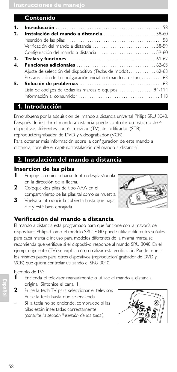en la dirección de la flecha. Coloque dos pilas de tipo AAA en el compartimiento de las pilas, tal como se muestra. Vuelva a introducir la cubierta hasta que haga clic y esté bien encajada. Verificación del mando a distancia El mando a distancia está programado para que funcione con la mayoría de dispositivos Philips. Como el modelo SRU 3040 puede utilizar diferentes señales para cada marca e incluso para modelos diferentes de la misma marca, se recomienda que verifique si el dispositivo responde al mando SRU 3040. En el ejemplo siguiente (TV) se explica cómo realizar esta verificación. Puede repetir los mismos pasos para otros dispositivos (reproductor/ grabador de DVD y VCR) que quiera controlar utilizando el SRU 3040. Español Ejemplo de TV: 1 Encienda el televisor manualmente o utilice el mando a distancia original. Sintonice el canal 1. 2 Pulse la tecla TV para seleccionar el televisor. Pulse la tecla hasta que se encienda. Si la tecla no se enciende, compruebe si las pilas están insertadas correctamente (consulte la sección ‘Inserción de las pilas’).