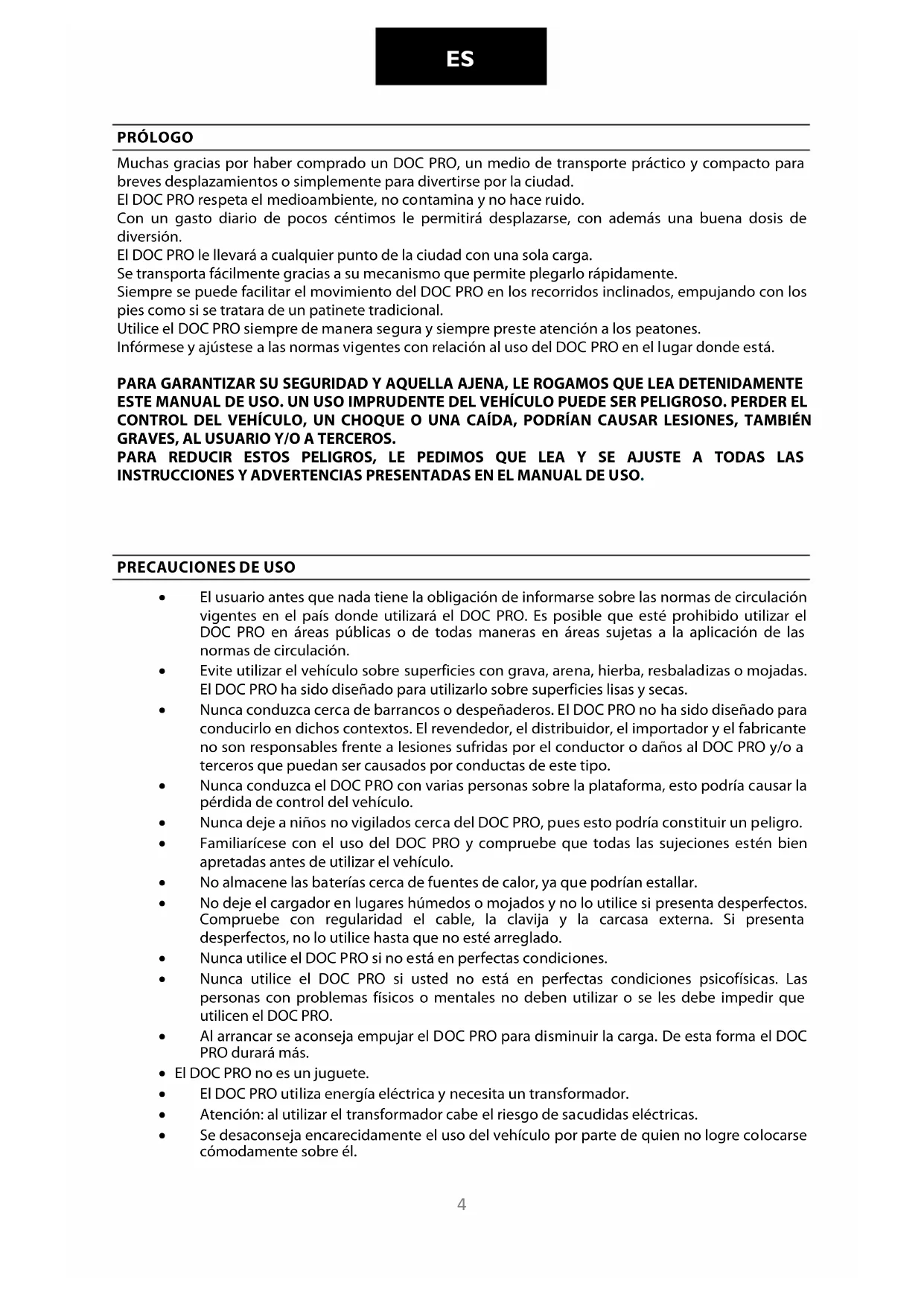 PRÓLOGO Muchas gracias por haber comprado un DOC PRO, un medio de transporte práctico y compacto para breves desplazamientos o simplemente para divertirse por la ciudad. El DOC PRO respeta el medioambiente, no contamina y no hace ruido. Con un gasto diario de pocos céntimos le permitirá desplazarse, con además una buena dosis de diversión. El DOC PRO le llevará a cualquier punto de la ciudad con una sola carga. Se transporta fácilmente gracias a su mecanismo que permite plegarlo rápidamente. Siempre se puede facilitar el movimiento del DOC PRO en los recorridos inclinados, empujando con los pies como si se tratara de un patinete tradicional. Utilice el DOC PRO siempre de manera segura y siempre preste atención a los peatones. Infórmese y ajústese a las normas vigentes con relación al uso del DOC PRO en el lugar donde está. PARA GARANTIZAR SU SEGURIDAD Y AQUELLA AJENA, LE ROGAMOS QUE LEA DETENIDAMENTE ESTE MANUAL DE USO. UN USO IMPRUDENTE DEL VEHÍCULO PUEDE SER PELIGROSO. PERDER EL CONTROL DEL VEHÍCULO, UN CHOQUE O UNA CAÍDA, PODRÍAN CAUSAR LESIONES, TAMBIÉN GRAVES, AL USUARIO Y/O A TERCEROS. PARA REDUCIR ESTOS PELIGROS, LE PEDIMOS QUE LEA Y SE AJUSTE A TODAS LAS INSTRUCCIONES Y ADVERTENCIAS PRESENTADAS EN EL MANUAL DE USO.