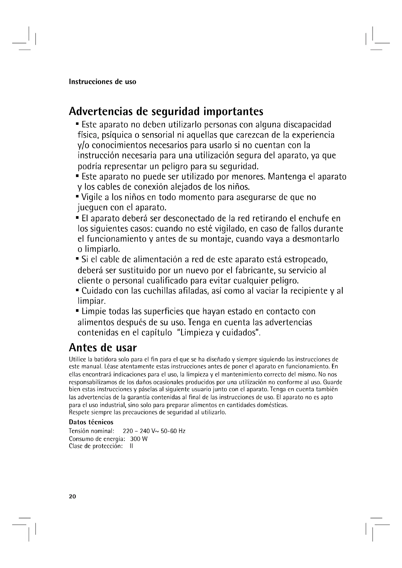 - Limpie todas las superficies que hayan estado en contacto con alimentos después de su uso. Tenga en cuenta las advertencias contenidas en el capítulo “Limpieza y cuidados”. Antes de usar Utilice la batidora solo para el fin para el que se ha diseñado y siempre siguiendo las instrucciones de este manual. Léase atentamente estas instrucciones antes de poner el aparato en funcionamiento. En ellas encontrará indicaciones para el uso, la limpieza y el mantenimiento correcto del mismo. No nos responsabilizamos de los daños ocasionales producidos por una utilización no conforme al uso. Guarde bien estas instrucciones y páselas al siguiente usuario junto con el aparato. Tenga en cuenta también las advertencias de la garantía contenidas al final de las instrucciones de uso. El aparato no es apto para el uso industrial, sino solo para preparar alimentos en cantidades domésticas. Respete siempre las precauciones de seguridad al utilizarlo. Datos técnicos Tensión nominal: 220 – 240 V~ 50-60 Hz Consumo de energía: 300 W Clase de protección: II21