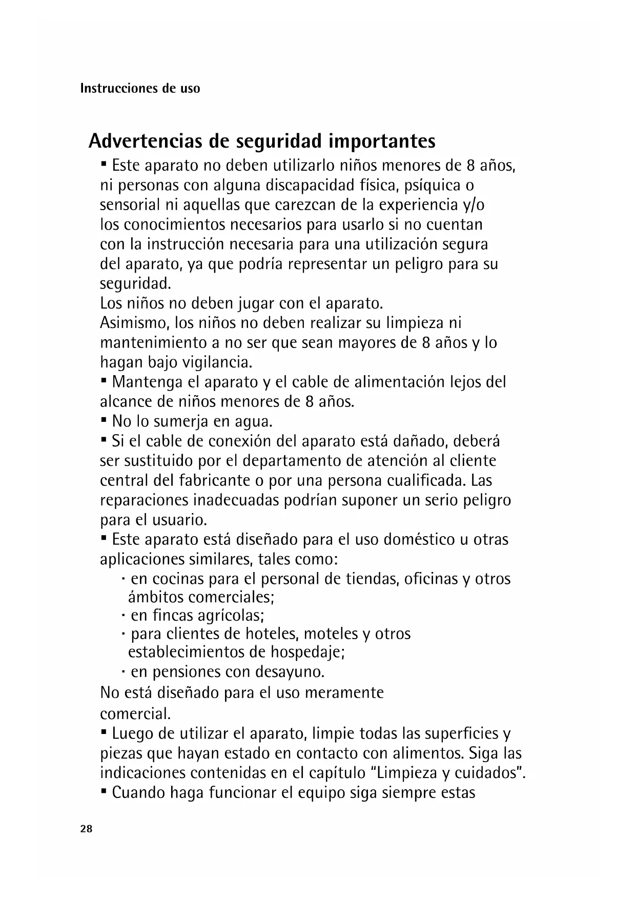 - Este aparato no deben utilizar niños menosadores de 8 años, ni personas con una失落 discapacidad fisica, psiquica o sensorial ni aquellas que carezcan de la experiencia y/o los conocimientos necessarios para usar si noCNTAN con la instruccion necesaria para unautilizacion segura del aparato, ya que podra representar un peligro para suutenidad.