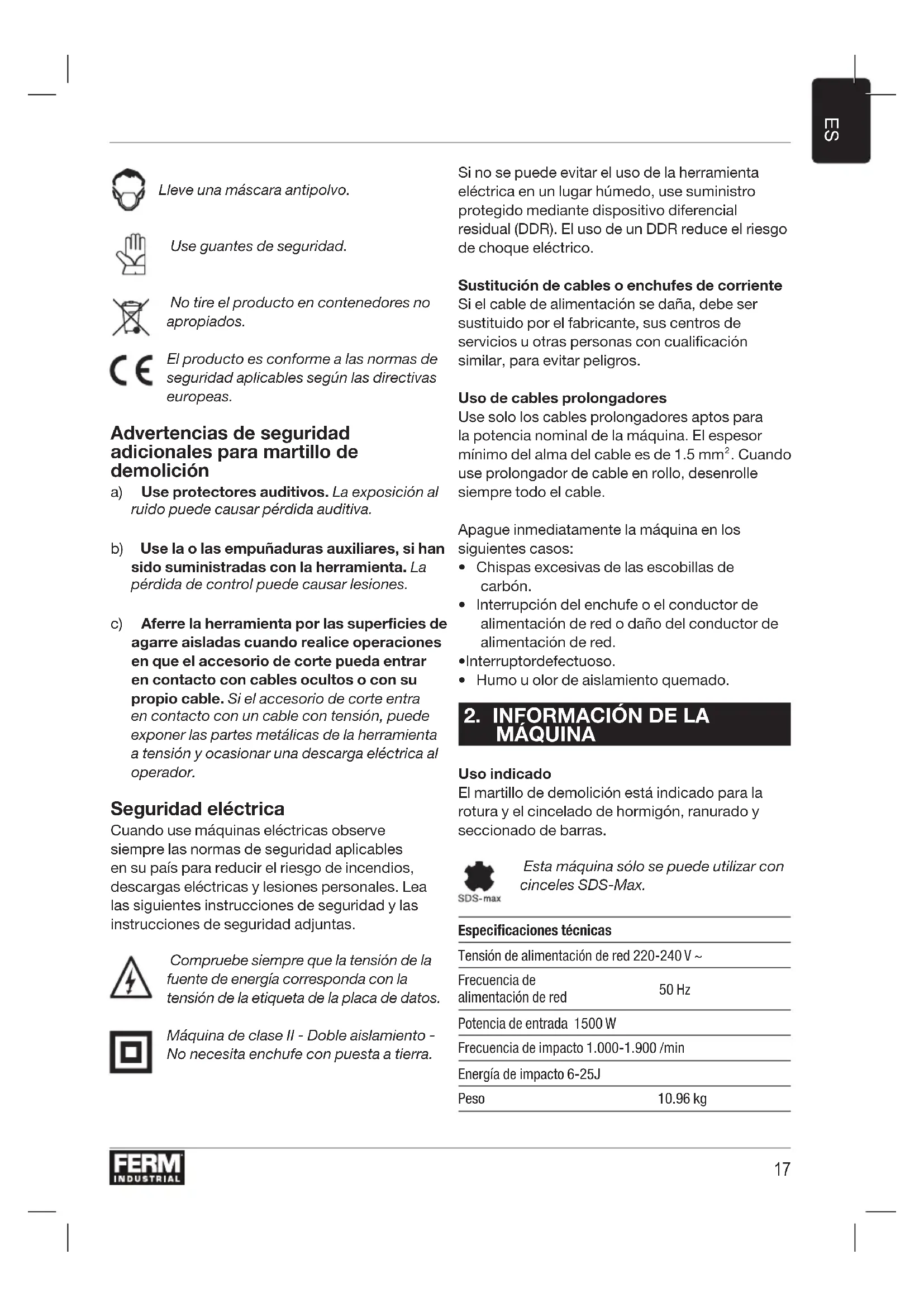 Lleve una máscara antipolvo. Use guantes de seguridad. No tire el producto en contenedores no apropiados. El producto es conforme a las normas de seguridad aplicables según las directivas europeas. Advertencias de seguridad adicionales para martillo de demolición a) Use protectores auditivos. La exposición al ruido puede causar pérdida auditiva. b) Use la o las empuñaduras auxiliares, si han sido suministradas con la herramienta. La pérdida de control puede causar lesiones. c) Aferre la herramienta por las superficies de agarre aisladas cuando realice operaciones en que el accesorio de corte pueda entrar en contacto con cables ocultos o con su propio cable. Si el accesorio de corte entra en contacto con un cable con tensión, puede exponer las partes metálicas de la herramienta a tensión y ocasionar una descarga eléctrica al operador. Seguridad eléctrica Cuando use máquinas eléctricas observe siempre las normas de seguridad aplicables en su país para reducir el riesgo de incendios, descargas eléctricas y lesiones personales. Lea las siguientes instrucciones de seguridad y las instrucciones de seguridad adjuntas. Compruebe siempre que la tensión de la fuente de energía corresponda con la tensión de la etiqueta de la placa de datos. Máquina de clase II - Doble aislamiento - No necesita enchufe con puesta a tierra. Si no se puede evitar el uso de la herramienta eléctrica en un lugar húmedo, use suministro protegido mediante dispositivo diferencial residual (DDR). El uso de un DDR reduce el riesgo de choque eléctrico. Sustitución de cables o enchufes de corriente Si el cable de alimentación se daña, debe ser sustituido por el fabricante, sus centros de servicios u otras personas con cualificación similar, para evitar peligros. Uso de cables prolongadores Use solo los cables prolongadores aptos para la potencia nominal de la máquina. El espesor mínimo del alma del cable es de 1.5 mm