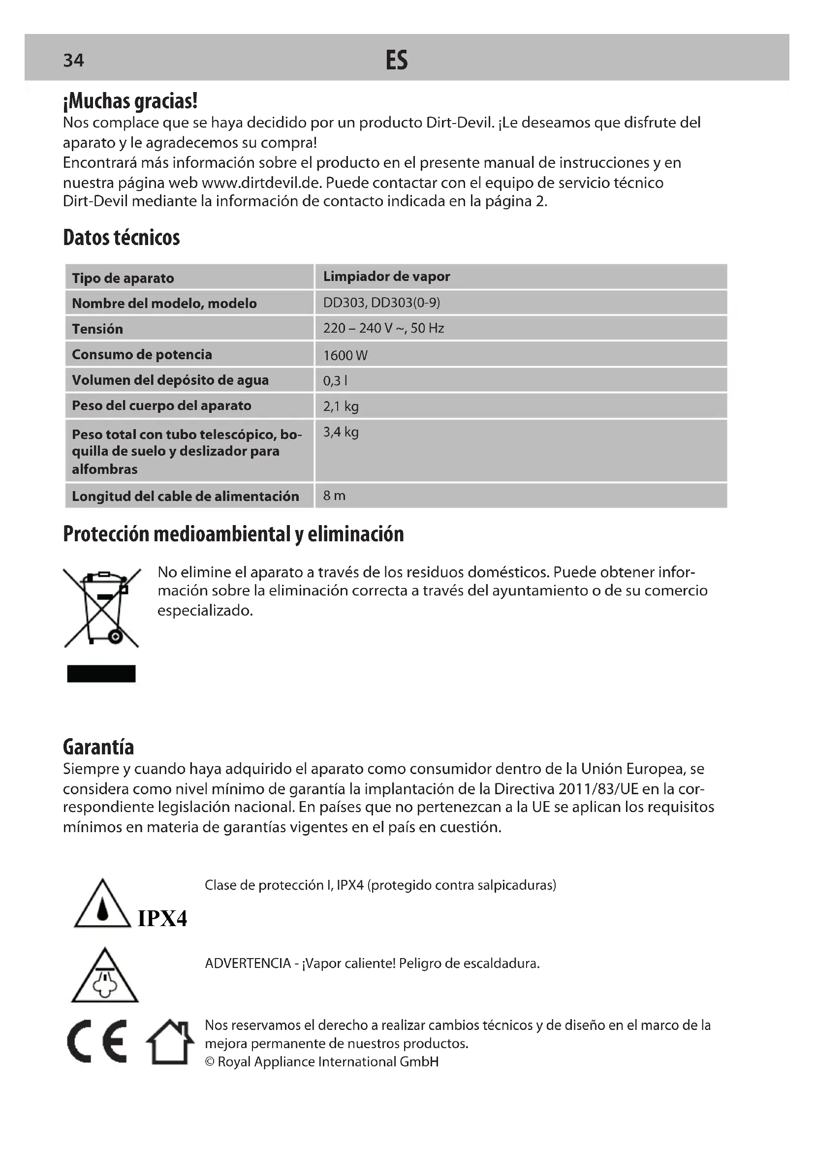 33IPX4 Protección medioambiental y eliminación No elimine el aparato a través de los residuos domésticos. Puede obtener infor- mación sobre la eliminación correcta a través del ayuntamiento o de su comercio especializado. Garantía Siempre y cuando haya adquirido el aparato como consumidor dentro de la Unión Europea, se considera como nivel mínimo de garantía la implantación de la Directiva 2011/83/UE en la cor- respondiente legislación nacional. En países que no pertenezcan a la UE se aplican los requisitos mínimos en materia de garantías vigentes en el país en cuestión. Nos reservamos el derecho a realizar cambios técnicos y de diseño en el marco de la mejora permanente de nuestros productos.© Royal Appliance International GmbH ¡Muchas gracias! Nos complace que se haya decidido por un producto Dirt-Devil. ¡Le deseamos que disfrute del aparato y le agradecemos su compra! Encontrará más información sobre el producto en el presente manual de instrucciones y en nuestra página web www.dirtdevil.de. Puede contactar con el equipo de servicio técnico Dirt-Devil mediante la información de contacto indicada en la página 2. Datos técnicos Tipo de aparatoLimpiador de vaporNombre del modelo, modeloDD303, DD303(0-9)Tensión220 – 240 V ~, 50 HzConsumo de potencia1600 WVolumen del depósito de agua0,3 lPeso del cuerpo del aparato2,1 kgPeso total con tubo telescópico, bo-quilla de suelo y deslizador para alfombras3,4 kgLongitud del cable de alimentación 8 m ADVERTENCIA - ¡Vapor caliente! Peligro de escaldadura.Clase de protección I, IPX4 (protegido contra salpicaduras)