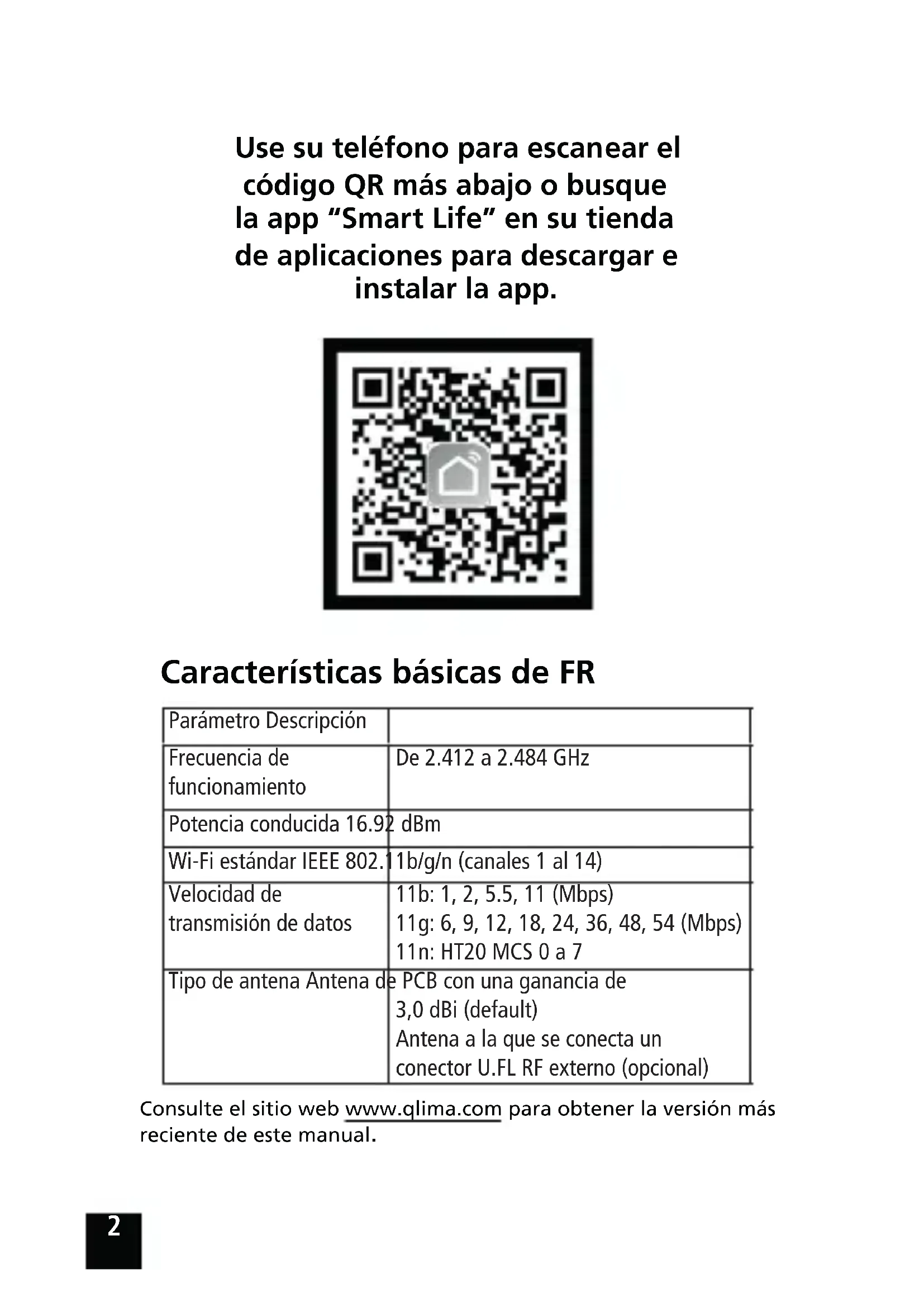 Use su teléfono para escanear el código QR más abajo o busque la app “Smart Life” en su tienda de aplicaciones para descargar e instalar la app. Características básicas de FR Consulte el sitio web www.qlima.com para obtener la versión más reciente de este manual. Parámetro Descripción Frecuencia de funcionamiento De 2.412 a 2.484 GHz Potencia conducida 16.92 dBm Wi-Fi estándar IEEE 802.11b/g/n (canales 1 al 14) Velocidad de transmisión de datos 11b: 1, 2, 5.5, 11 (Mbps) 11g: 6, 9, 12, 18, 24, 36, 48, 54 (Mbps) 11n: HT20 MCS 0 a 7 Tipo de antena Antena de PCB con una ganancia de 3,0 dBi (default) Antena a la que se conecta un conector U.FL RF externo (opcional)3