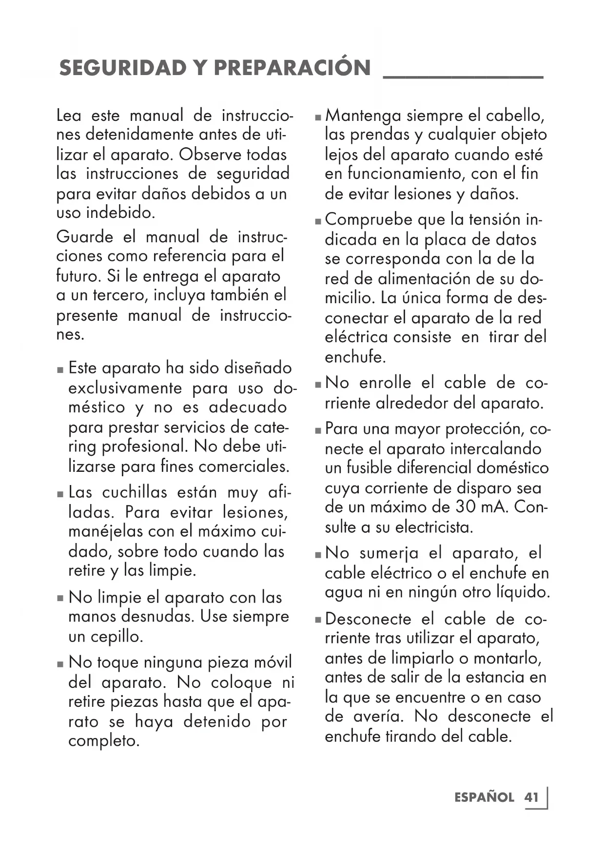 Desconecte el cable de co- rriente tras utilizar el aparato, antes de limpiarlo o montarlo, antes de salir de la estancia en la que se encuentre o en caso de avería. No desconecte el enchufe tirando del cable.42 ESPAÑOL