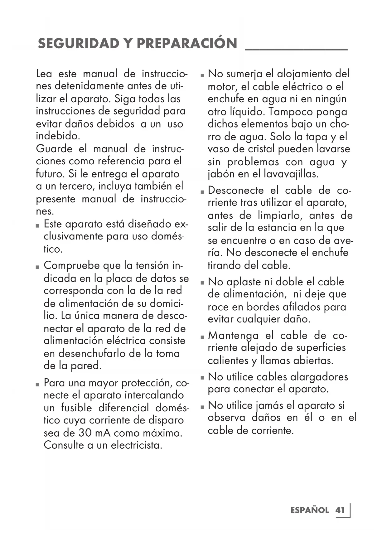 No sumerja el alojamiento del motor, el cable eléctrico o el enchufe en agua ni en ningún otro líquido. Tampoco ponga dichos elementos bajo un cho- rro de agua. Solo la tapa y el vaso de cristal pueden lavarse sin problemas con agua y jabón en el lavavajillas.