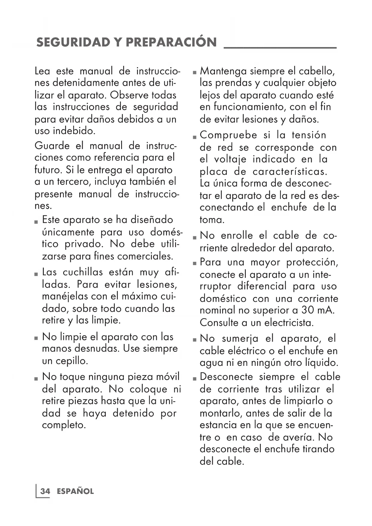 Desconecte siempre el cable de corriente tras utilizar el aparato, antes de limpiarlo o montarlo, antes de salir de la estancia en la que se encuen- tre o en caso de avería. No desconecte el enchufe tirando del cable.35 ESPAÑOL