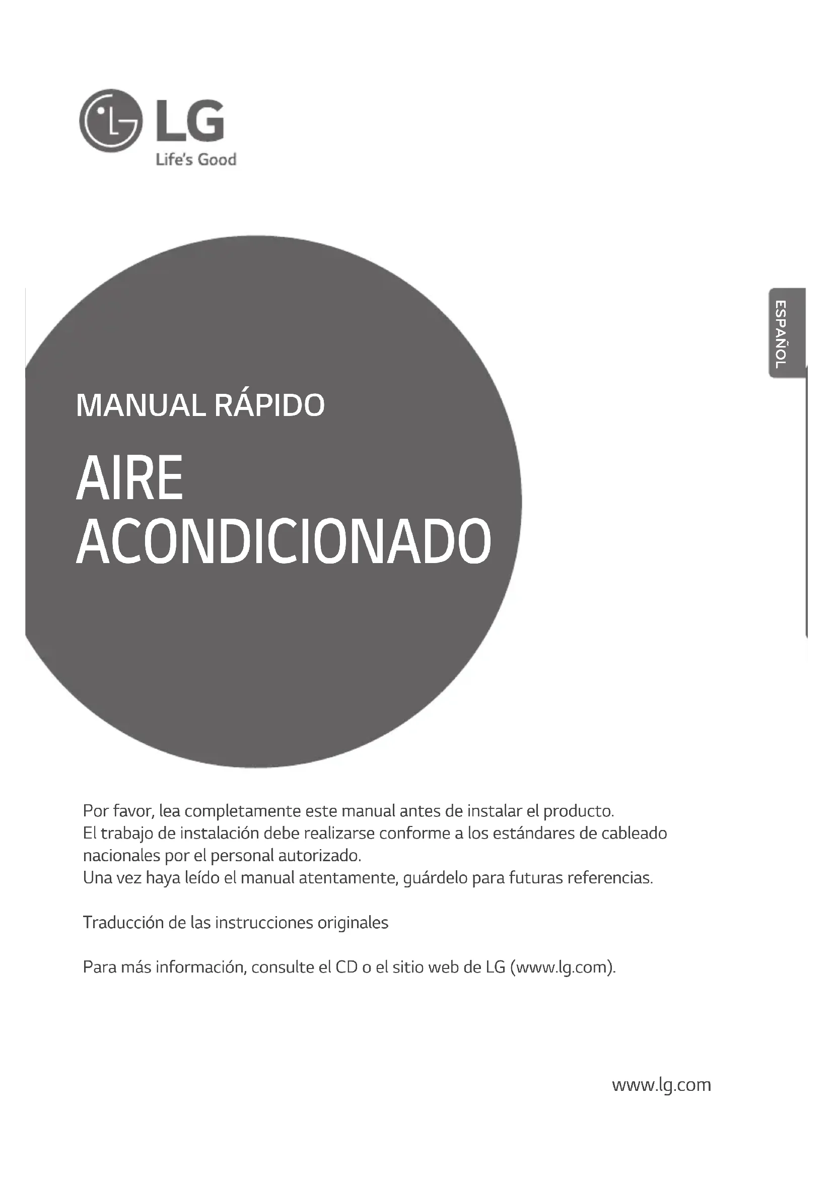 - Questo prodotto è stato applicato al circuito di protezione da sovra- corrente. L’errore si può verificare, ma è un comportamento nor- male. Dopo pochi minuti, funzionerà normalmente.10 MANUTENZIONE ITALIANOAIRE ACONDICIONADO www.lg.com Por favor, lea completamente este manual antes de instalar el producto. El trabajo de instalación debe realizarse conforme a los estándares de cableado nacionales por el personal autorizado. Una vez haya leído el manual atentamente, guárdelo para futuras referencias. Traducción de las instrucciones originales Para más información, consulte el CD o el sitio web de LG (www.lg.com).