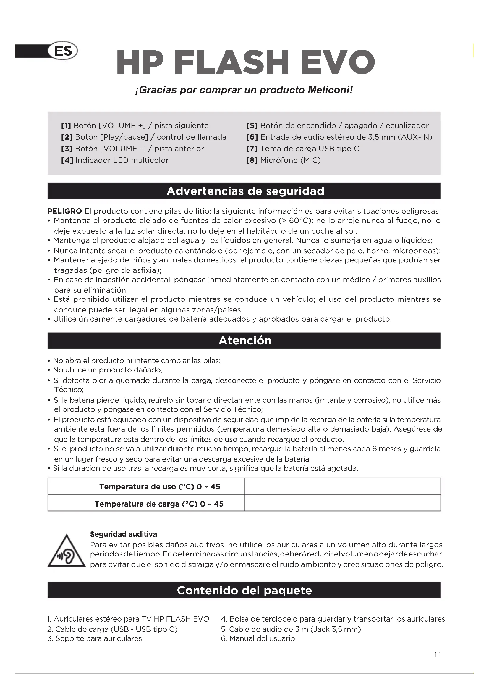 al mismo tiempo Indicador luminoso LED El indicador LED [4] proporciona una indicación útil del estado de funcionamiento del auricular a través de su color y modo de parpadeo.14 Especificaciones técnicas Tamaño del transductor 40mm Impedancia del altavoz 32Ω Respuesta en frecuencia 20Hz-20K Hz Versión Bluetooth V5.3 Frecuencias utilizadas 2.400GHz~2.4835 GHz Alcance de transmisión hasta 10m (campo abierto) Batería recargable 3.7V, 400mAh, 1.48Wh Salida de carga de la batería output DC 5V/500mA / PC USB Tiempo de carga 2.5 horas Duración de la batería 22 horas (*Nota1) Peso 182g Nota1: Con batería nueva, tras carga completa, conexión Bluetooth®, reproducción continua a 25°C a volumen medio. Notas Declaración de conformidad El fabricante, Meliconi S.p.A., declara que el tipo de equipo de radio, Auricular Bluetooth HP FLASH EVO, es conforme a la Directiva 2014/53/UE (RED). El texto completo de la Declaración de Conformidad UE está disponible en la siguiente dirección: www.meliconi.com/doc/hpflashevo Eliminación del producto La Directiva Europea 2012/19/UE sobre Residuos de Aparatos Eléctricos y Electrónicos (RAEE) exige que este equipo no se elimine en el flujo normal de residuos sólidos urbanos, sino que se recoja por separado para optimizar la recuperación y el reciclaje de los materiales que lo componen y evitar posibles daños a la salud y al medio ambiente debido a la presencia de sustancias potencialmente peligrosas. El símbolo del contenedor tachado aparece en todos los productos a modo de recordatorio. Los residuos pueden llevarse a los centros de recogida adecuados o entregarse gratuitamente al distribuidor donde se adquirió el equipo al comprar uno nuevo equivalente. Para más información sobre la correcta eliminación de estos aparatos, póngase en contacto con el servicio público correspondiente. La retirada de las pilas del producto es responsabilidad del consorcio que va a desechar el producto. Este símbolo indica que el producto contiene pilas recargables incorporadas sujetas a la Directiva Europea 2013/56/UE y, por lo tanto, no puede desecharse con los residuos domésticos normales. El producto debe desecharse en un punto de recogida adecuado o entregarse al minorista15