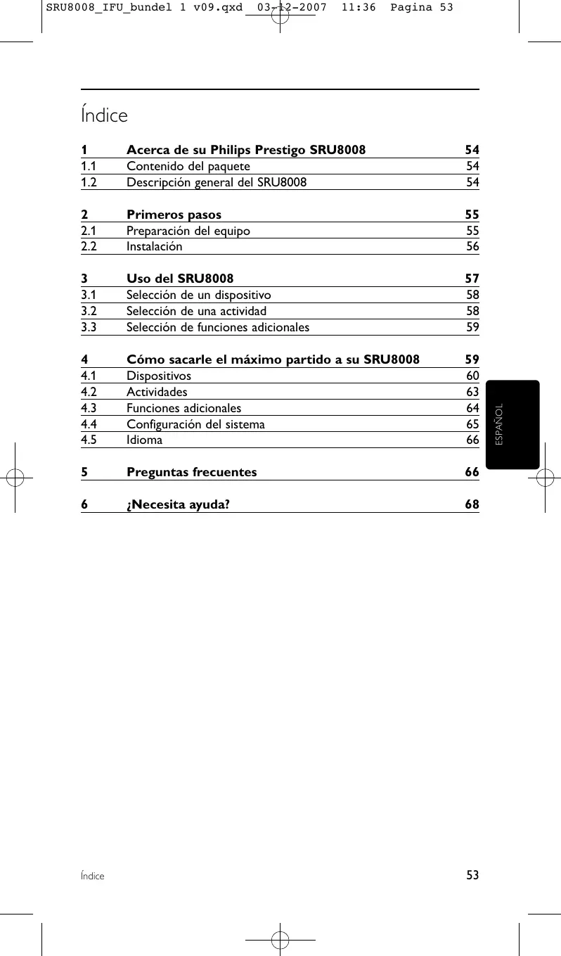 ESPAÑOL Índice Acerca de su Philips Prestigo SRU8008 Bienvenido a la creciente familia de propietarios de productos de Philips. El mando a distancia universal Philips Prestigo SRU8008 ha sido diseñado para permitirle controlar sus equipos. Podrá instalar hasta 8 dispositivos y hasta 8 actividades. Seleccione un dispositivo y seleccione una función del dispositivo mediante las teclas del SRU8008. Seleccione una actividad y automáticamente se iniciará una secuencia de pulsaciones de teclas, por ejemplo, para comenzar a ver un DVD o a reproducir un CD. Seleccione Funciones adicionales y asigne más funciones avanzadas al mando a distancia.