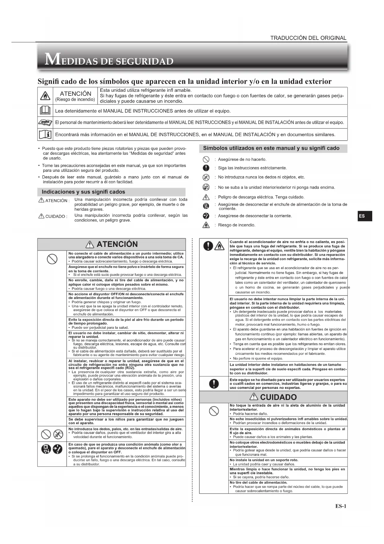 - Puesto que este producto tiene piezas rotatorias y piezas que pueden provo-car descargas eléctricas, lea atentamente las “Medidas de seguridad” antes de usarlo.• Tome las precauciones aconsejadas en este manual, ya que son importantes para una utilización segura del producto.• Después de leer este manual, guárdelo a mano junto con el manual de instalación para poder recurrir a él con facilidad. Indicaciones y sus signifi cados ATENCIÓN :Una manipulación incorrecta podría conllevar con toda probabilidad un peligro grave, por ejemplo, de muerte o de heridas graves. CUIDADO :Una manipulación incorrecta podría conllevar, según las condiciones, un peligro grave. Símbolos utilizados en este manual y su signifi cado : Asegúrese de no hacerlo. : Siga las instrucciones estrictamente. : No introduzca nunca los dedos ni objetos, etc. : No se suba a la unidad interior/exterior ni ponga nada encima. : Peligro de descarga eléctrica. Tenga cuidado. : Asegúrese de desconectar el enchufe de alimentación de la toma de corriente. : Asegúrese de desconectar la corriente. : Riesgo de incendio. ATENCIÓN No conecte el cable de alimentación a un punto intermedio; utilice una alargadera o conecte varios dispositivos a una sola toma de CA.• Podría causar sobrecalentamiento, fuego o descarga eléctrica.Asegúrese que el enchufe no tiene polvo e insértelo de forma segura en la toma de corriente. Si el enchufe está sucio puede provocar fuego o una descarga eléctrica.No enrolle, cambie, dañe ni tire del cable de alimentación, y no aplique calor ni coloque objetos pesados sobre el mismo.• Podría causar fuego o una descarga eléctrica.No accione el disyuntor OFF/ON ni desconecte/conecte el enchufe de alimentación durante el funcionamiento.• Podría generar chispas y originar un fuego.• Una vez que la se apaga la unidad interior con el controlador remoto, asegúrese de que coloca el disyuntor en OFF o que desconecta el enchufe de alimentación. Evite la exposición directa de la piel al aire frío durante un periodo de tiempo prolongado.• Puede ser perjudicial para la salud.El usuario no debe instalar, cambiar de sitio, desmontar, alterar ni reparar la unidad.• Si no se maneja correctamente, el acondicionador de aire puede causar fuego, descarga eléctrica, lesiones, escape de agua, etc. Consulte con su distribuidor.• Si el cable de alimentación está dañado, deberá ser sustituido por el fabricante o su agente de mantenimiento para evitar cualquier riesgo.Al instalar, reubicar o reparar la unidad, asegúrese de que en el circuito de refrigeración no entra ninguna otra sustancia que no sea el refrigerante especifi cado (R32).• La presencia de cualquier otra sustancia extraña, como aire por ejemplo, puede provocar una elevación anómala de la presión, una explosión o daños corporales.• El uso de un refrigerante distinto al especifi cado por el sistema oca-sionará fallos mecánicos, malfuncionamiento del sistema o averías en la unidad. En el peor de los casos, esto podría llegar a ser un serio impedimento para garantizar el uso seguro del producto.Este aparato no debe ser utilizado por personas (incluidos niños) que presenten una discapacidad física, sensorial o mental así como aquellos que dispongan de la experiencia o el conocimiento, a menos que lo hagan bajo la supervisión o instrucción relativa al uso del aparato por una persona responsable de su seguridad.Se debe supervisar a los niños para garantizar que no jueguen con el aparato. No introduzca los dedos, palos, etc. en las entradas/salidas de aire.• Podría causar daños, puesto que el ventilador del interior gira a alta velocidad durante el funcionamiento. En caso de que se produzca una condición anómala (como olor a quemado), pare el aparato y desconecte el enchufe de alimentación o coloque el disyuntor en OFF.• Si se prolonga el funcionamiento en la condición anómala puede pro-ducirse un fallo, fuego o una descarga eléctrica. En tal caso, consulte a su distribuidor. Cuando el acondicionador de aire no enfría o no calienta, es posi-ble que haya una fuga del refrigerante. Si se produce una fuga de refrigerante, detenga el equipo, ventile bien la habitación y póngase inmediatamente en contacto con su distribuidor. Si una reparación exige la recarga de la unidad con refrigerante, solicite más informa-ción al técnico de servicio.• El refrigerante que se usa en el acondicionador de aire no es per-judicial. Normalmente no tiene fugas. Sin embargo, si hay fugas de refrigerante y éste entra en contacto con fuego o con fuentes de calor tales como un calentador del ventilador, un calentador de queroseno o un horno de cocina, se generarán gases perjudiciales y puede causarse un incendio.El usuario no debe intentar nunca limpiar la parte interna de la uni-dad interior. Si la parte interna de la unidad requiriera una limpieza, póngase en contacto con el distribuidor.• Un detergente inadecuado puede provocar daños a los materiales plásticos del interior de la unidad, lo que podría causar escapes de agua. Si el detergente entra en contacto con las partes eléctricas del motor, provocará mal funcionamiento, humo o fuego.• El aparato debe guardarse en una habitación sin fuentes de ignición en funcionamiento continuo (por ejemplo: llamas abiertas, un aparato de gas en funcionamiento o un calentador eléctrico en funcionamiento).• Tenga en cuenta que es posible que los refrigerantes no emitan olores.• Para acelerar el proceso de descongelación y limpiar el aparato utilice únicamente los medios recomendados por el fabricante. • No perfore ni queme el equipo.La unidad interior debe instalarse en habitaciones de un tamaño superior a la superfi cie de suelo especifi cada. Póngase en contac-to con su distribuidor.Este equipo se ha diseñado para ser utilizado por usuarios expertos o cualifi cados en comercios, industrias ligeras y granjas, o para su uso comercial por perso