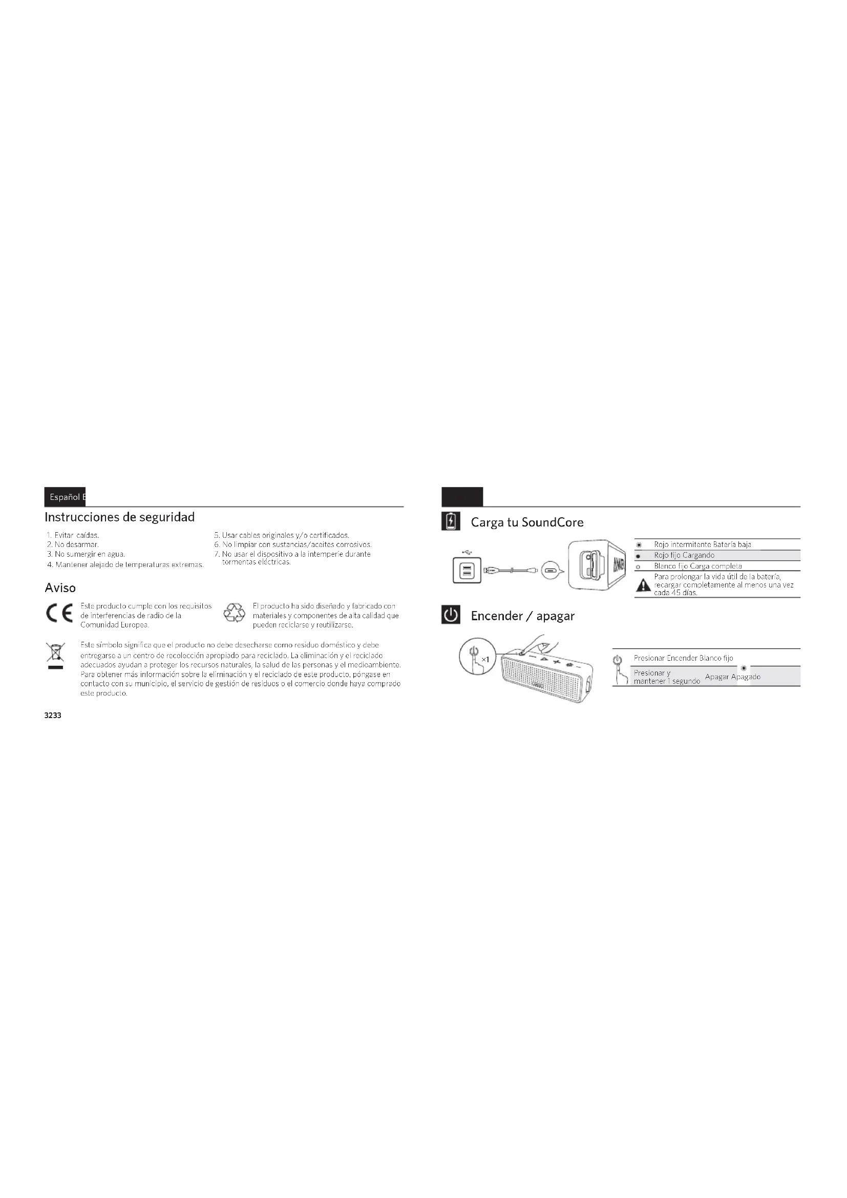 tormentas eléctricas. Aviso Este producto cumple con los requisitos de interferencias de radio de la Comunidad Europea. El producto ha sido diseñado y fabricado con materiales y componentes de alta calidad que pueden reciclarse y reutilizarse. Este símbolo significa que el producto no debe desecharse como residuo doméstico y debe entregarse a un centro de recolección apropiado para reciclado. La eliminación y el reciclado adecuados ayudan a proteger los recursos naturales, la salud de las personas y el medioambiente. Para obtener más información sobre la eliminación y el reciclado de este producto, póngase en contacto con su municipio, el servicio de gestión de residuos o el comercio donde haya comprado este producto. Carga tu SoundCore Rojo intermitente Batería baja Rojo fijo Cargando Blanco fijo Carga completa Para prolongar la vida útil de la batería, recargar completamente al menos una vez cada 45 días. Encender / apagar